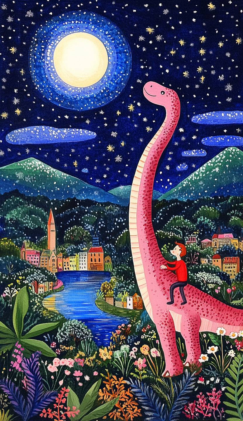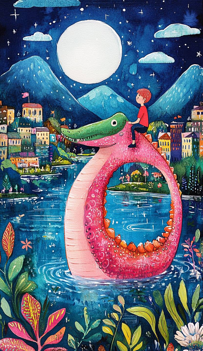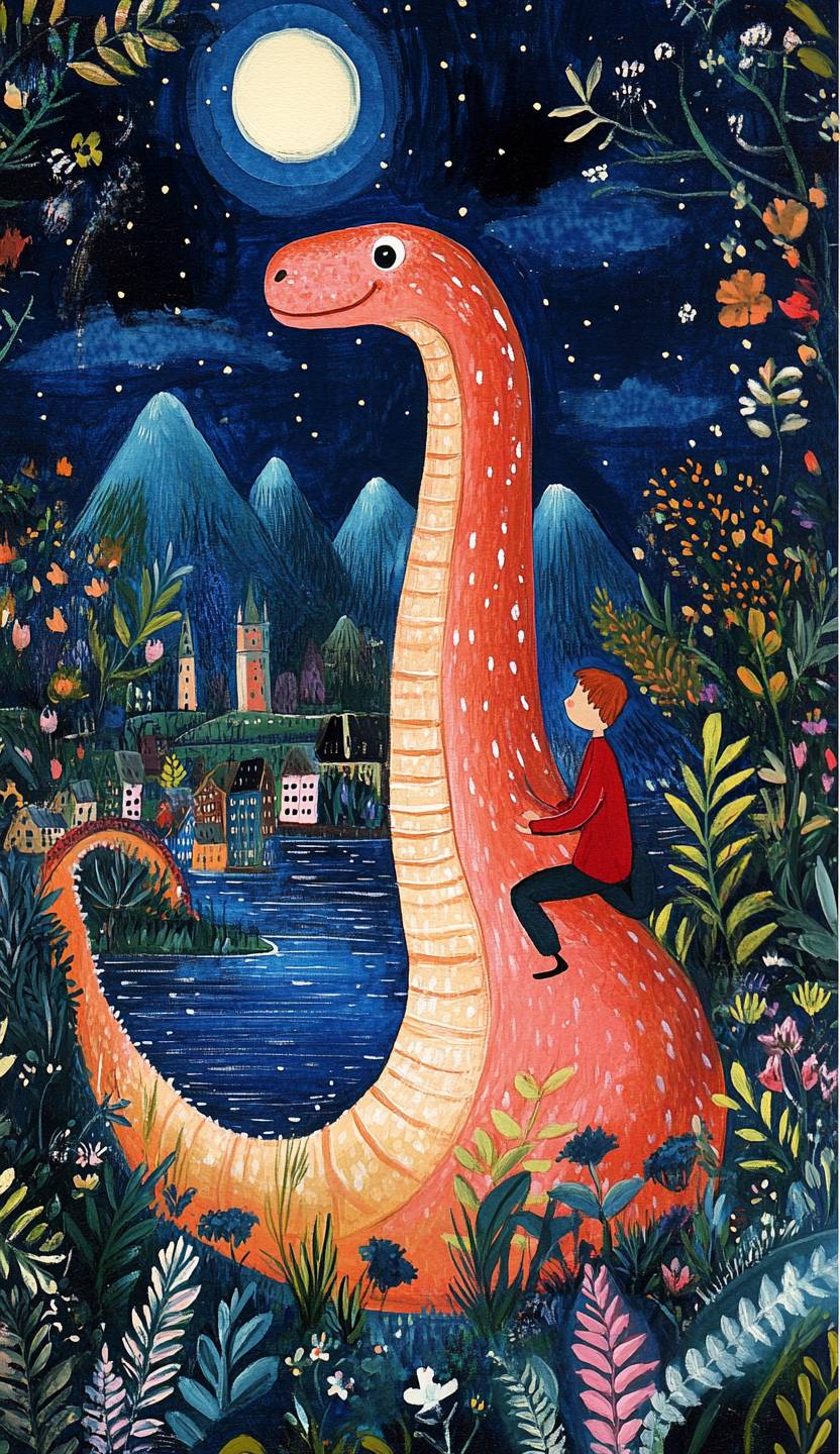 A cute boy riding on the back of the Loch Ness monster, floating in an enchanted lake surrounded by a small town and mountains. The whimsical folk art style features a pastel blue background with floral accents, surrounded by greenery, and a bright white light glowing behind it. A cute pink dinosaur wearing red is walking around the city, in the style of a gouache painting, like a naive child's illustration. --ar 37:64 --style raw --personalize gys9gw5 --v 6.1