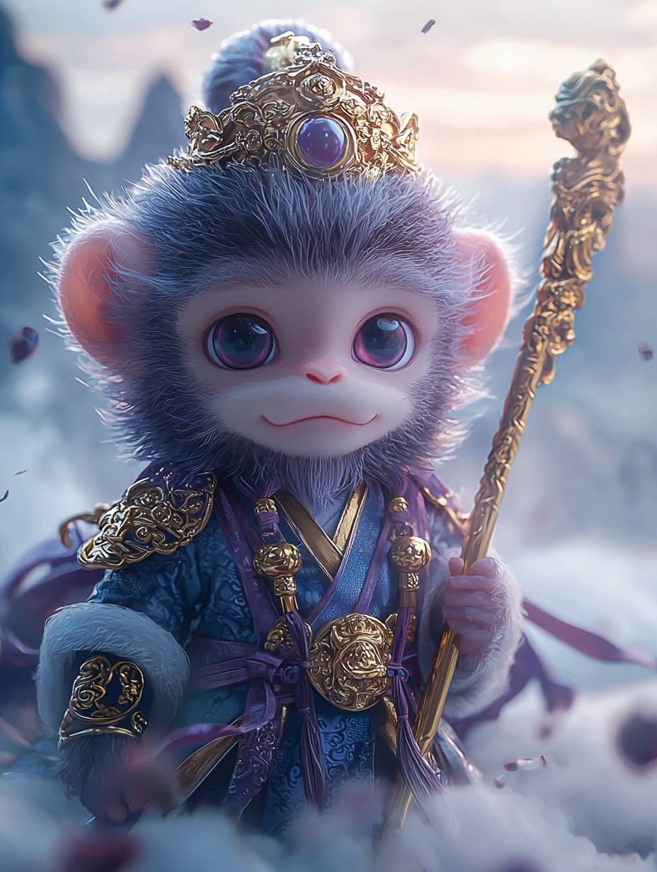 Le dieu singe dans la mythologie chinoise, croisement d'animaux, boîte surprise, design IP, Pop Mart, chibi, tenant un long trône en or, portant une couronne violette et dorée, se tenant dans les nuages, avec une expression mignonne, le fond des montagnes célestes dans la mythologie chinoise, enveloppé de brouillard, schéma de couleurs Dunhuang, coloré, élégant, digne d'un conte de fées, détails fins, description détaillée, couleur de rêve, meilleure qualité, UHD, 16K, haute résolution, présentation à l'octane, Cinema 4D, super détaillé, complexités détaillées, rendu 3D, mignon.