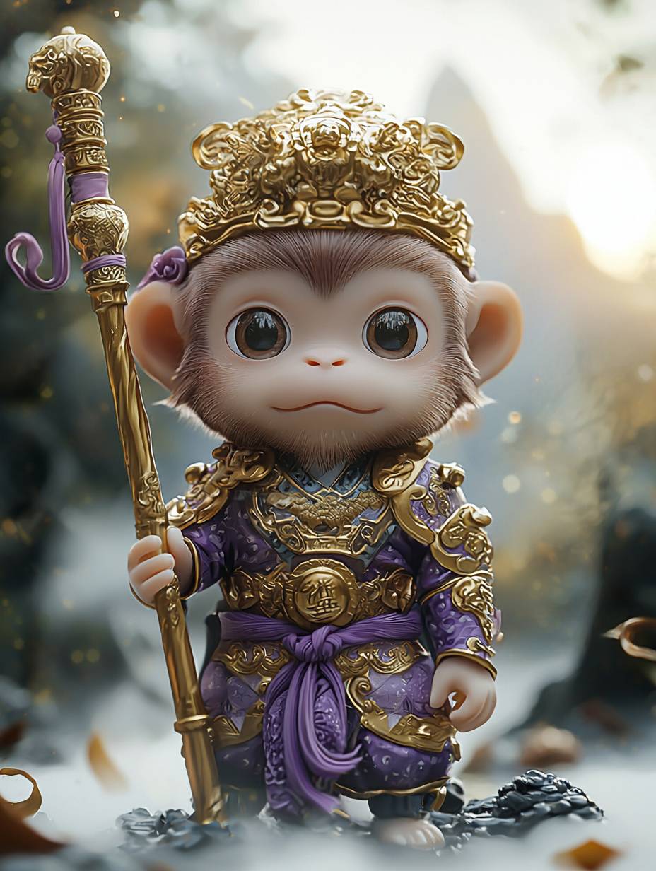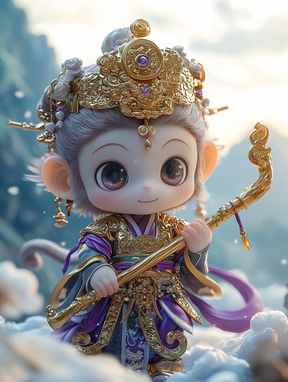 the monkey god in chinese mythology, animal crossing, blind box, ip design, pop-mart, chibi, with a long golden truncheon, wearing a purple and gold crown, standing in the clouds, with a cute expression, the background of celestial mountains in chinese mythology, in a fog, dunhuang color scheme, colorful, fancy, fairy tale, fine detail, detailed description, dream color, best quality, uhd, 16 k, high resolution, octane presentation, cinema4d, super-detailed, detailed intricacies, 3d rendering, cute --ar 3:4 --quality 2 --style raw --stylize 300 --v 6.1