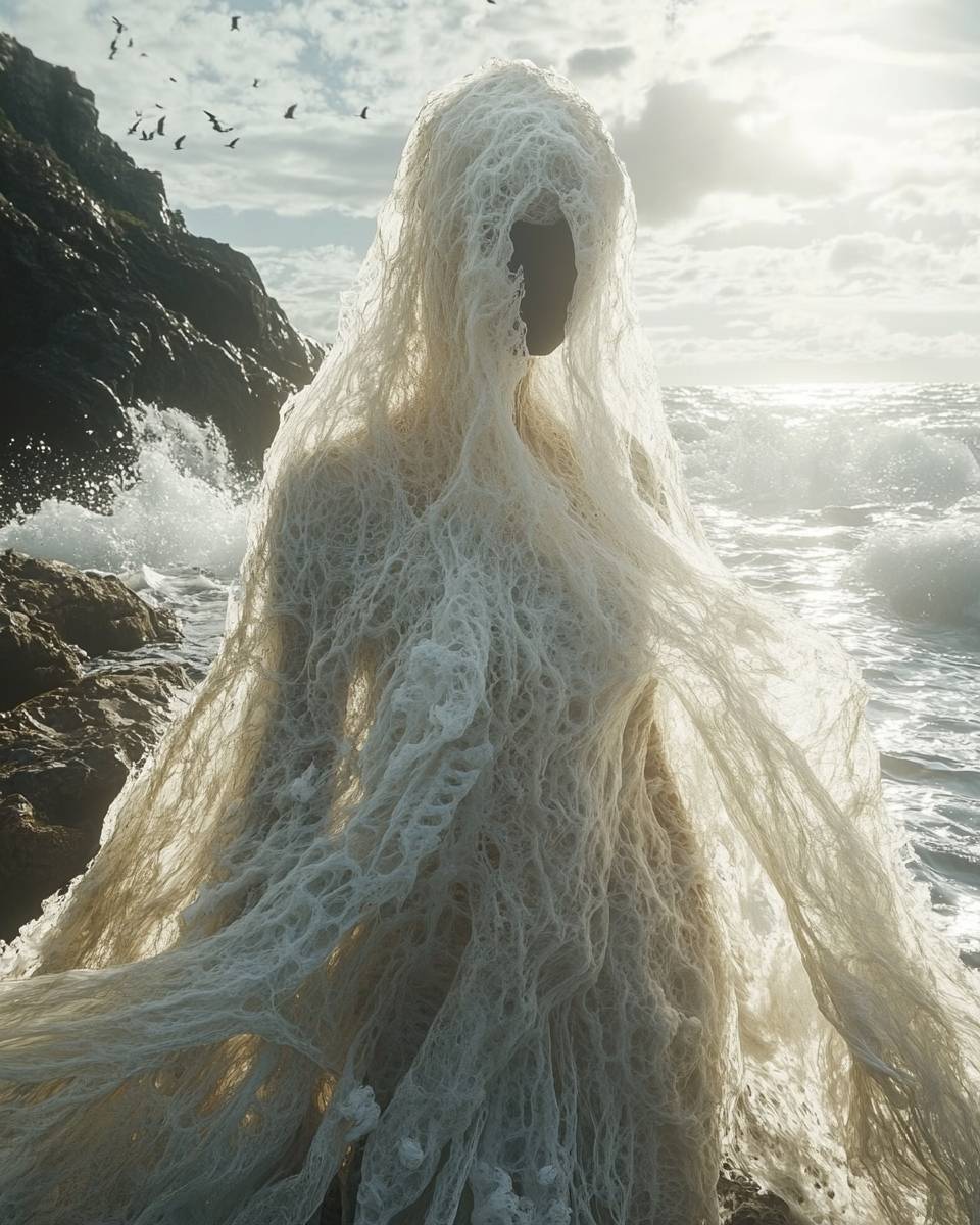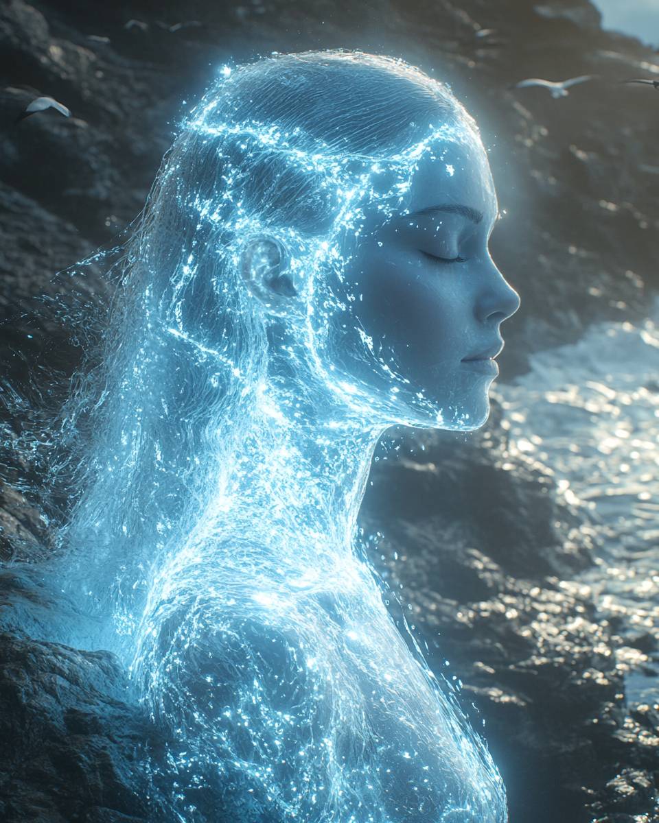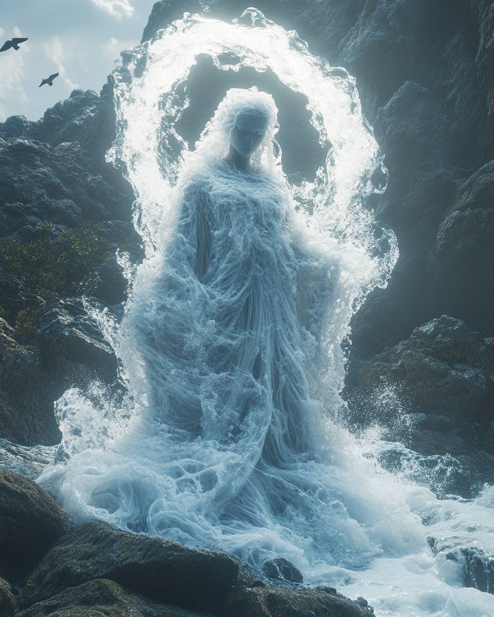 A hyper-realistic 3D render of the Goddess of foam waves standing on the shore, her form composed of water and foam, with droplets of water suspended in the air around her. Her expression is serene, as if she commands the very waves that crash against the rocks. The sunlight shines through her translucent body, creating a halo effect. The background is a rocky coastline, with waves crashing against the shore and seagulls flying overhead. Created Using: advanced 3D modeling, ray tracing, realistic water physics, high-resolution textures, volumetric lighting, natural color palette, cinematic depth of field, photorealistic details --chaos 10 --ar 4:5 --stylize 300 --v 6.1