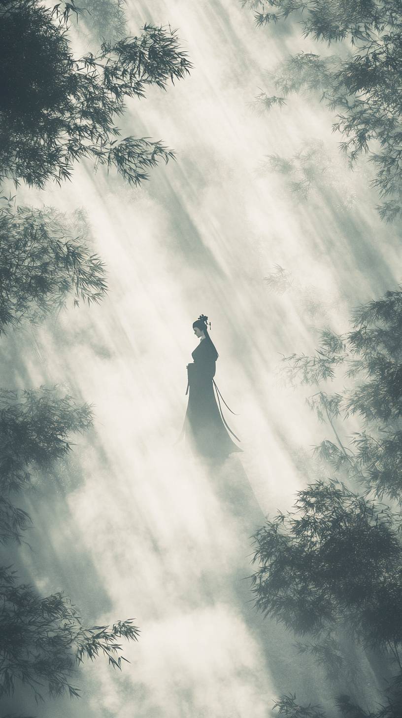 A woman in Hanfu stands among the bamboo groves, her silhouette illuminated by golden light. The scene is rendered with a minimalist aesthetic and an ethereal glow, creating a dreamlike atmosphere. This artwork captures the essence of ancient Chinese culture through its elegant composition and soft tones. It embodies simplicity and tranquility, showcasing traditional aesthetics within a modern context. The woman is dressed in traditional , with the artwork rendered in the style of minimalism and tranquility. --chaos 6 --ar 9:16 --personalize df1ce3t --stylize 750 --v 6.1