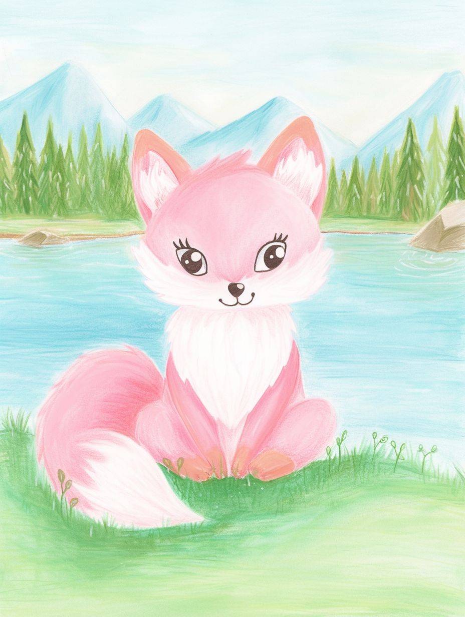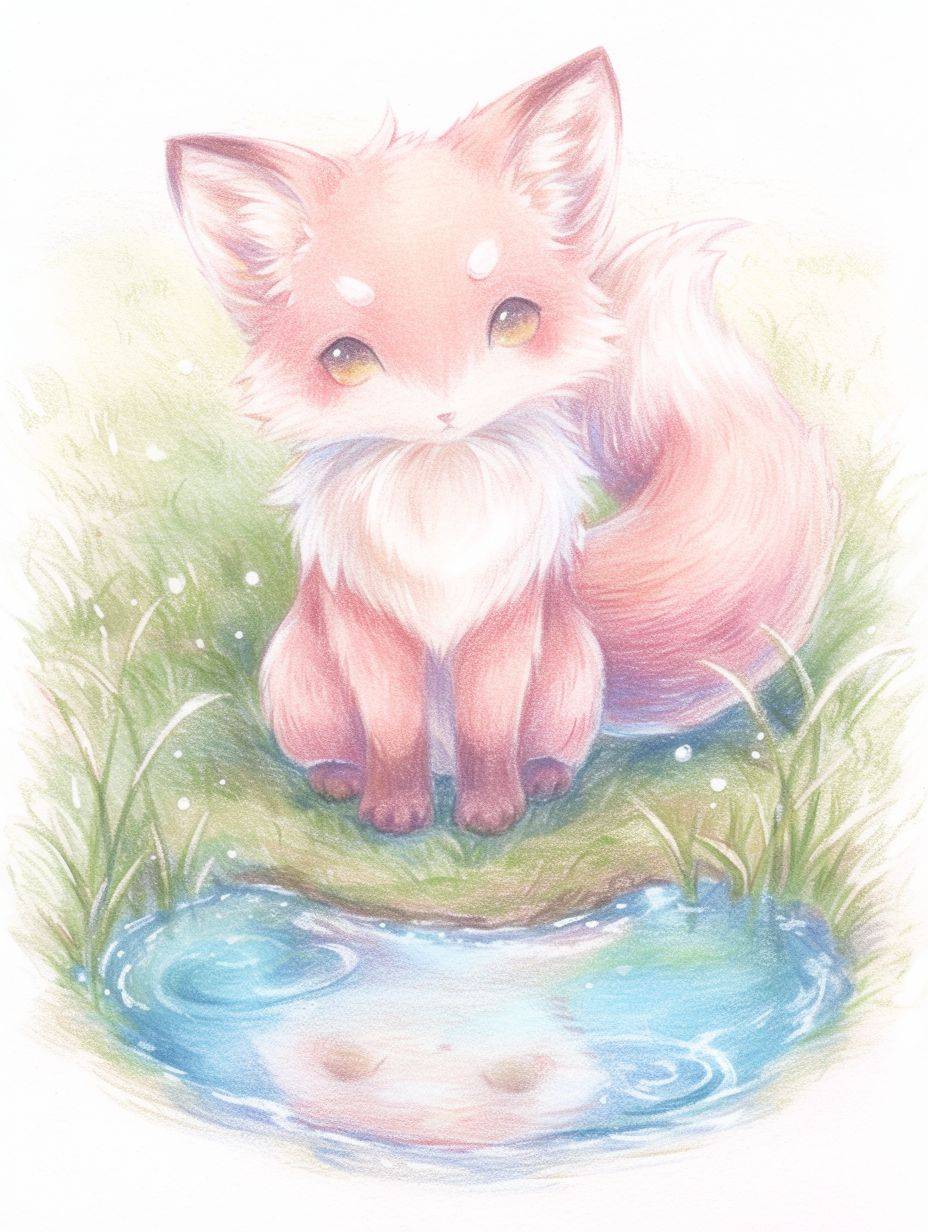 A cute pink fox with white eyebrows and tail sits on the grass in front of an empty pond. It is a colored pencil illustration in the style of a children's book with pastel colors and simple lines --ar 3:4 --niji 6 --style raw