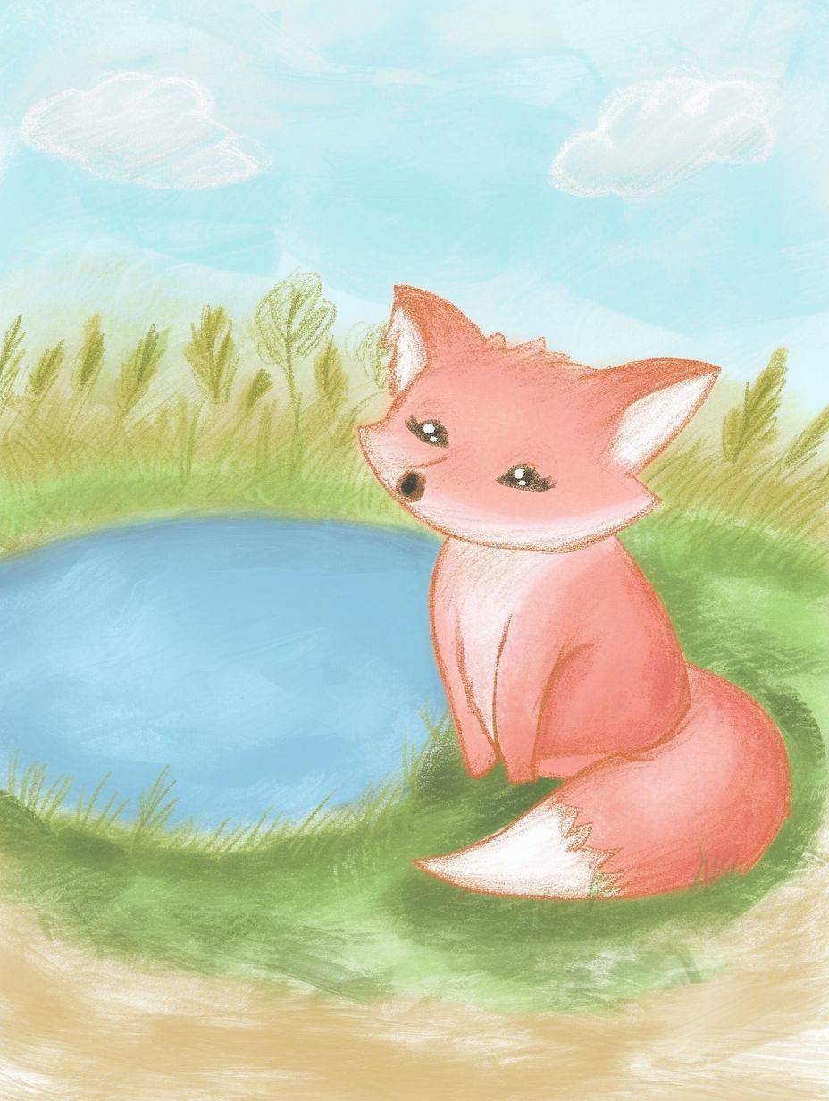 Un mignon renard rose avec des sourcils et une queue blancs est assis dans l'herbe devant un étang vide. C'est une illustration au crayon de couleur dans le style d'un livre pour enfants, avec des couleurs pastel et des lignes simples.