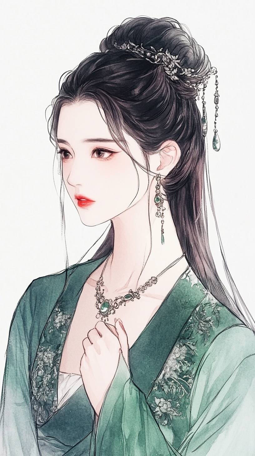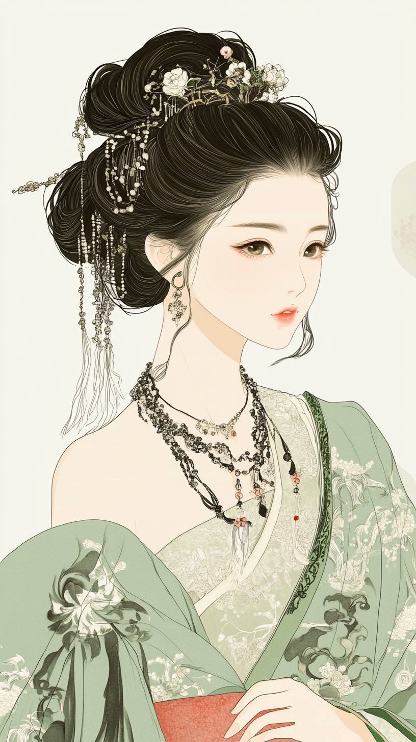 A young woman wearing a green Hanfu, with simple lines and black ink line drawings, flat illustrations, against a white background, adorned with exquisite jewelry on her neck, her hair in an updo with long braids, holding one hand to the side of her chest, in the style of traditional Chinese . --ar 9:16 --v 6.1