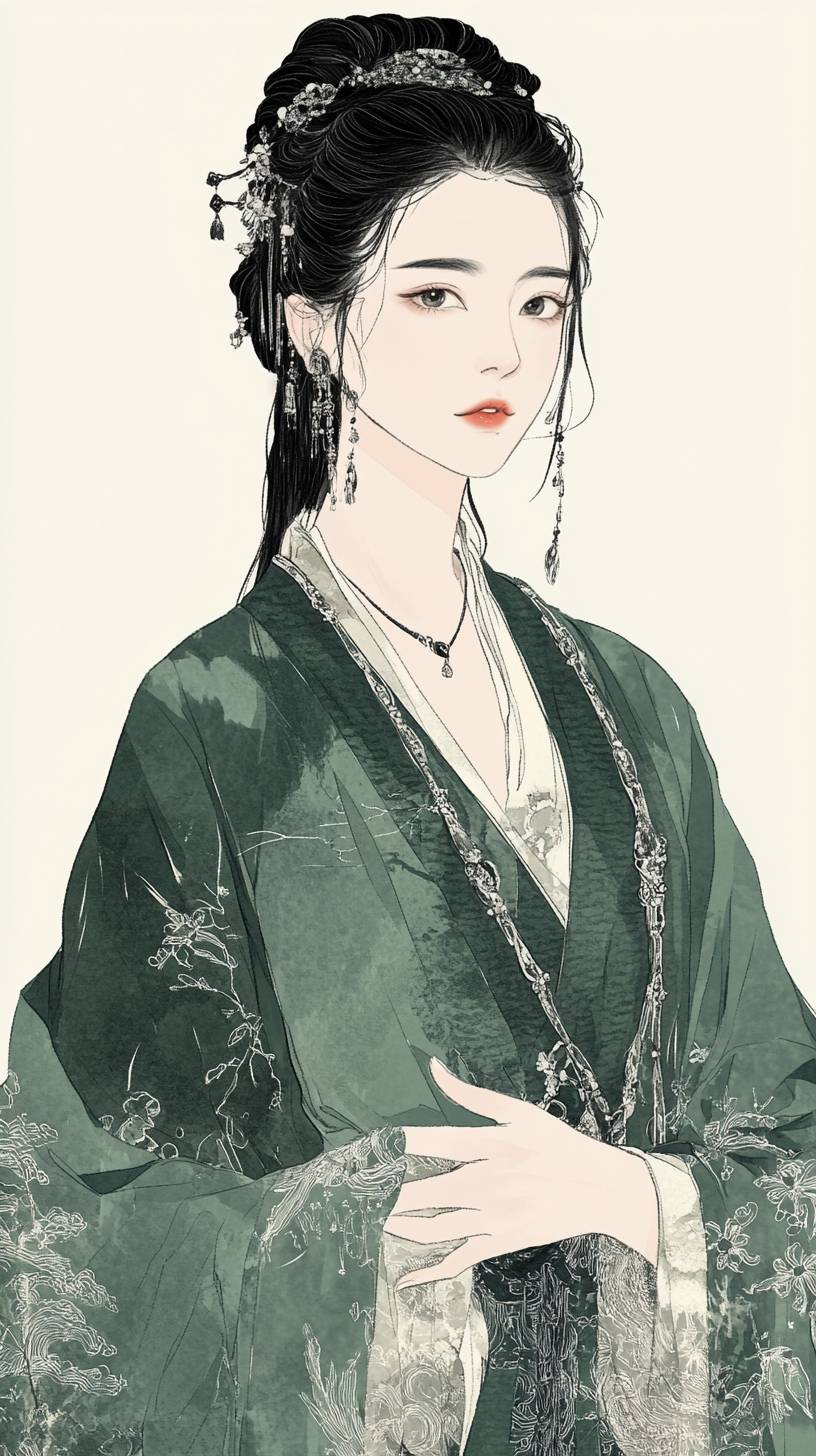 Une jeune femme portant un Hanfu vert, avec des lignes simples et des dessins à l'encre noire, des illustrations plates sur un fond blanc, ornée de bijoux exquis autour du cou, ses cheveux coiffés en chignon avec de longues tresses, tenant une main sur le côté de sa poitrine, dans le style traditionnel chinois.