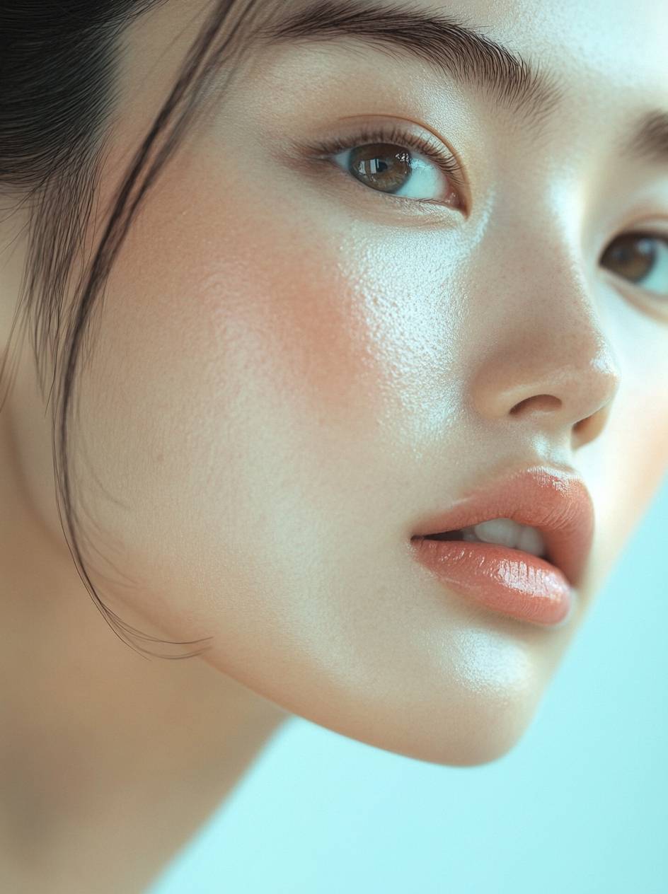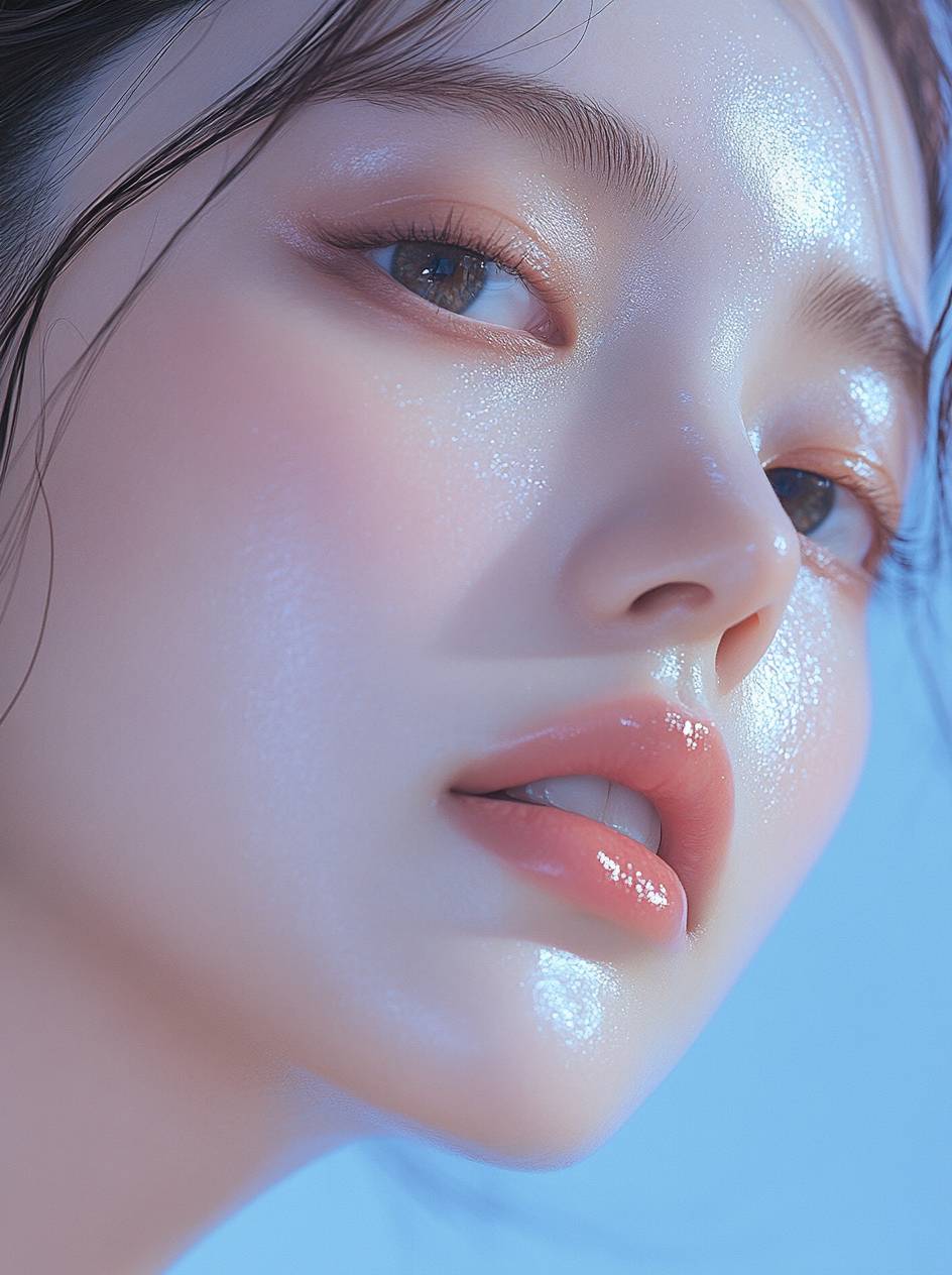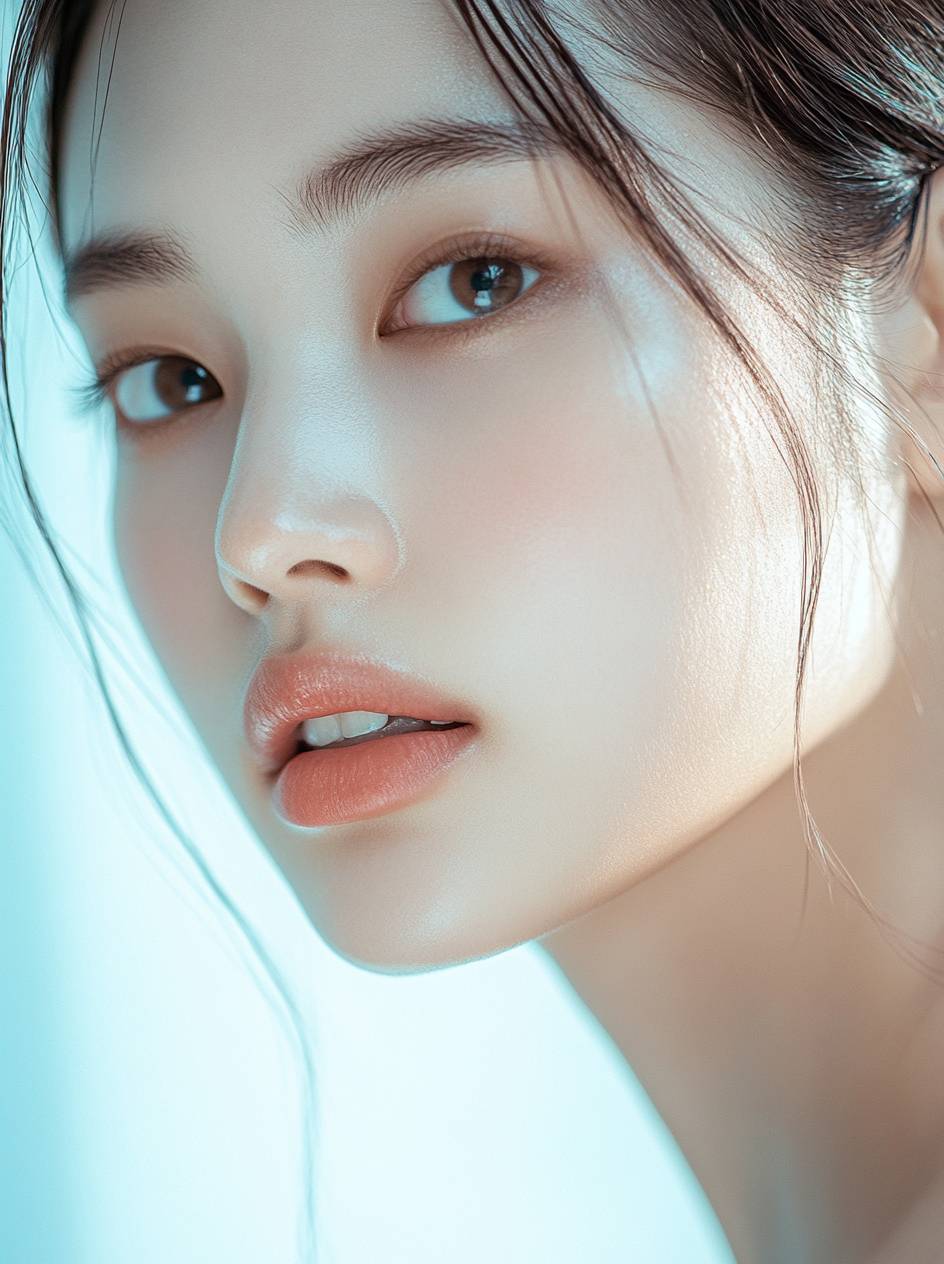 Un modèle de beauté coréenne avec une peau claire, gros plan sur le visage et le cou, style de photographie publicitaire pour des produits de soin de la peau, éclairage doux mettant l'accent sur la texture de ses traits du visage, maquillage naturel, fond propre en tons de bleu clair, mettant en avant des couleurs vives et des détails délicats, avec un teint qui brille d'une légère lueur scintillante. L'ambiance générale est fraîche et élégante, reflétant le style de la beauté naturelle.