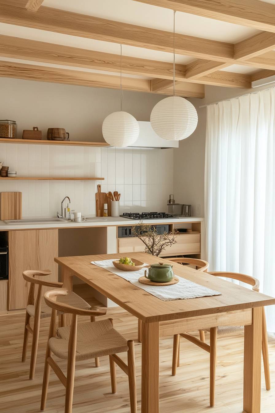 White walls, a dining table with chairs and wooden legs in the style of Japanese minimalism, a white ceiling light, a clean background, a close-up of the tabletop, wooden furniture, a warm color tone, simple lines, a natural wood texture, bright lighting, fresh colors, and a comfortable atmosphere. A small kitchen is placed on the left side, with an oven embedded below it. There's also a tea set next to the stove. On one end, there was a green honey jar and some fruits. --ar 2:3 --stylize 250 --v 6.1