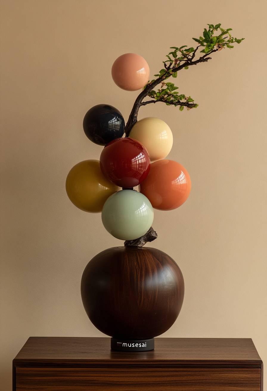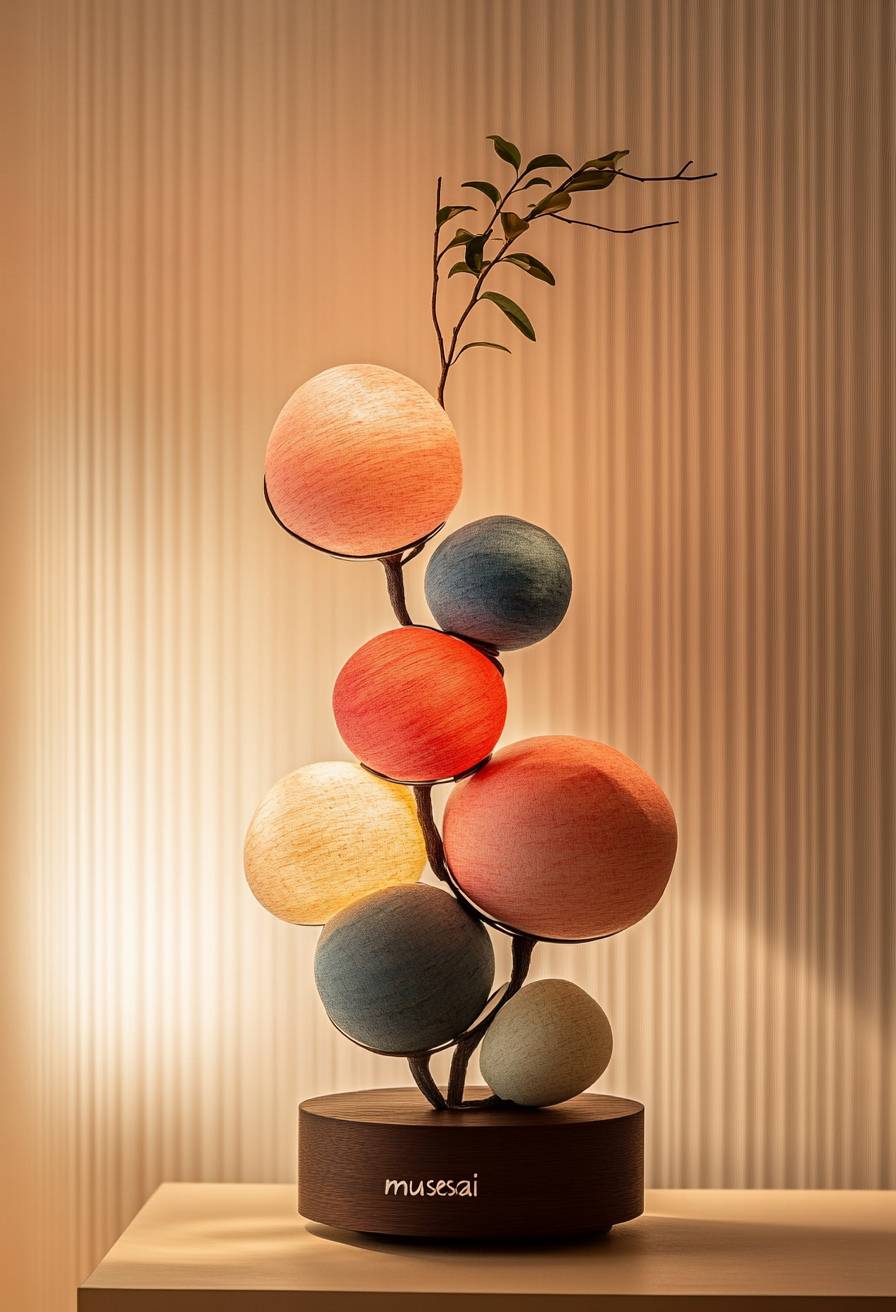 Une lampe de table moderne et unique composée de plusieurs ballons ronds et plats de différentes couleurs ressemblant à des champignons, empilés pour former la forme d'un tronc d'arbre abstrait. La base est en bois foncé et porte l'inscription « musesai » au-dessus. Elle est adossée à un mur beige avec des lignes verticales, créant une atmosphère chaleureuse. Une plante ou une branche de fleurs pousse d'un ballon. Le style est minimaliste et naturel. Haute résolution.