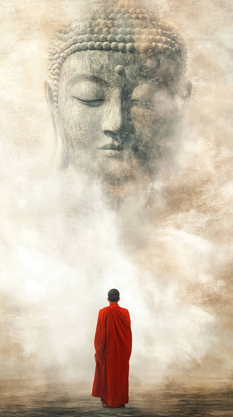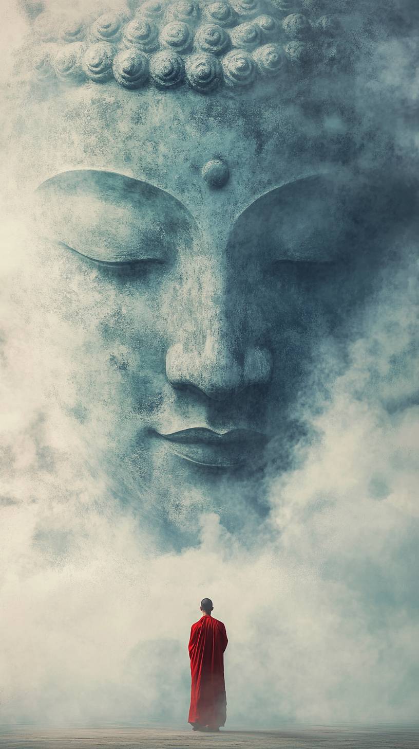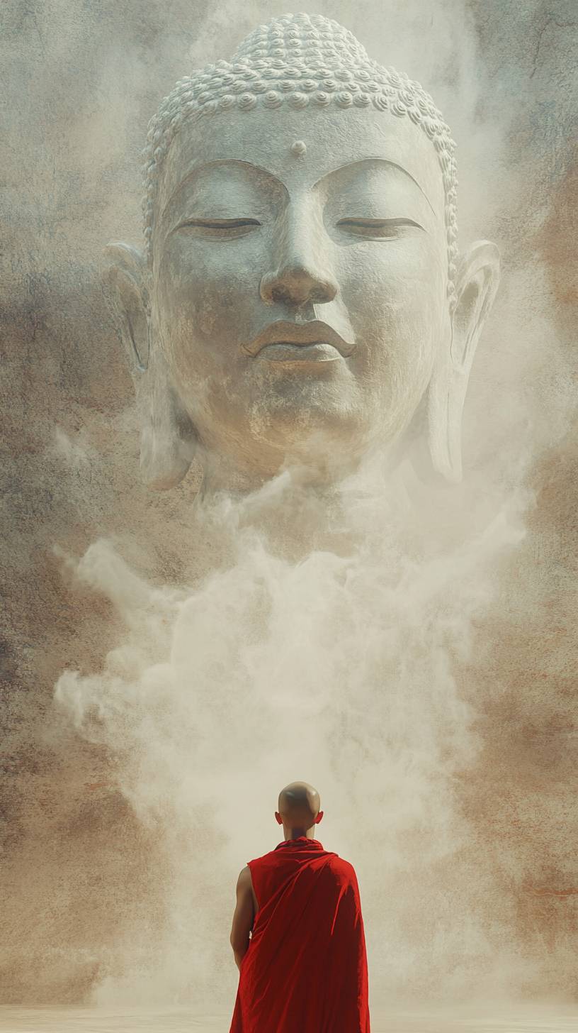 Une scène sereine où un moine vêtu d'une robe rouge vive se tient dos au spectateur, regardant vers le haut un colossal visage éthéré de Bouddha qui semble se former à partir de la brume et de la fumée. Le visage du Bouddha occupe la partie supérieure de l'image, avec une expression douce et calme. L'arrière-plan est une surface claire et texturée, créant une atmosphère spirituelle et contemplative.