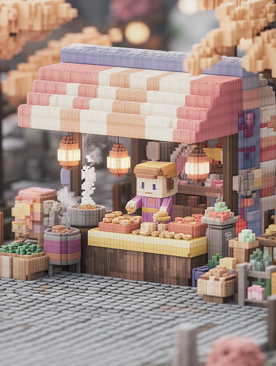 Diorama en voxel miniature d'un stand de marché nocturne, lanternes lumineuses, petite figurine de marchand, articles alimentaires détaillés, style d'art pixel isométrique, plats fumants, décorations suspendues, chemin en pavés, nostalgie chaleureuse, filtre lumineux chaleureux, lumières de fées scintillantes, particules de vapeur montantes, occlusion ambiante subtile, blocs de voxel, ombrage pixel.