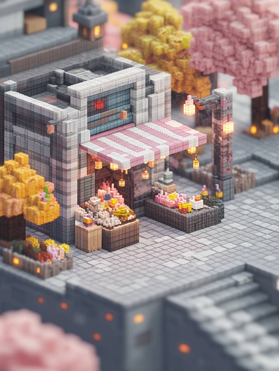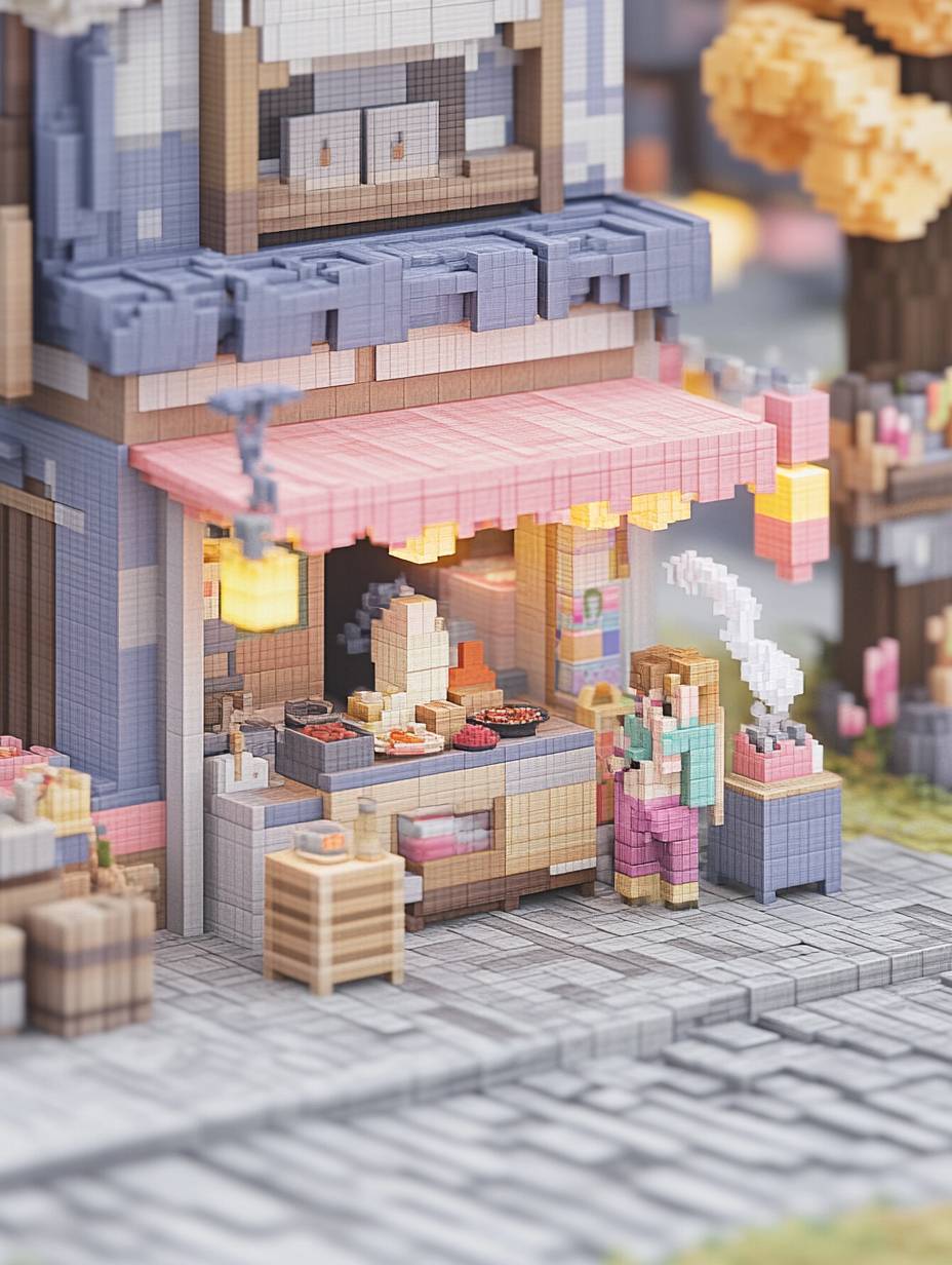 miniature voxel diorama of night market stall, glowing lanterns, tiny merchant figure, detailed food items, isometric pixel art style, steaming dishes, hanging decorations, cobblestone path, cozy nostalgia, warm glow filter, twinkling fairy lights, rising steam particles, subtle ambient occlusion, voxel blocks, pixel shading, --ar 3:4 --style raw --sref 525723305 --personalize rd9y55c --v 6.1