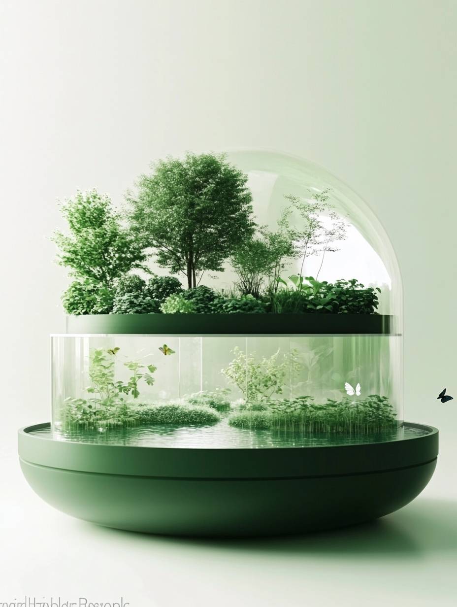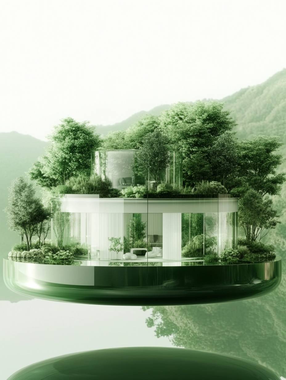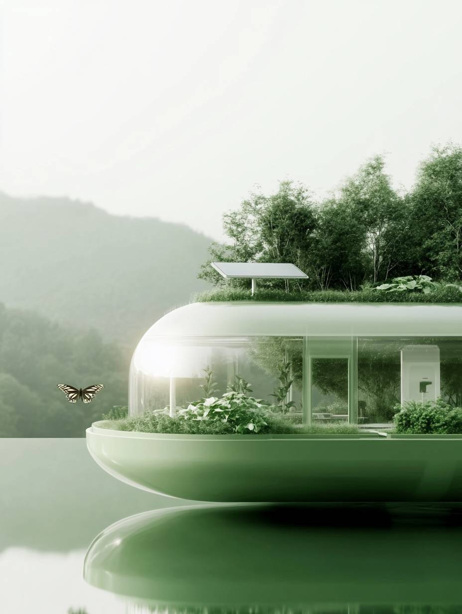 Style utopique solarpunk, jardins flottants verdoyants entourant un lac circulaire serein, vaisseau écologique avancé glissant sur l'eau, harmonie restaurée, fermes verticales, collecteurs solaires, drones papillons, cercles concentriques avec un point central, habitat écologique suspendu, lumière dorée de l'heure dorée, doux reflets d'objectif, palette de couleurs verts luxuriants et azur.