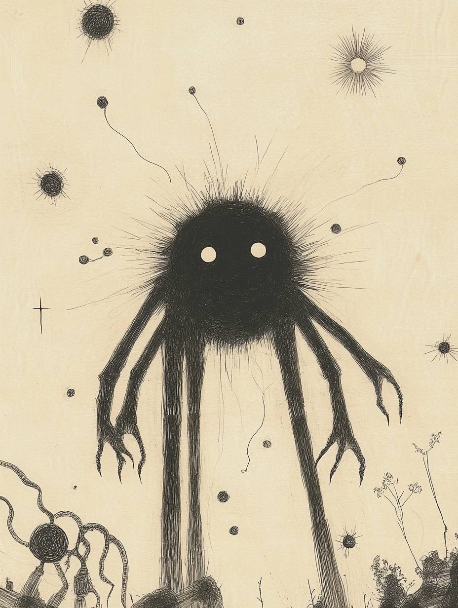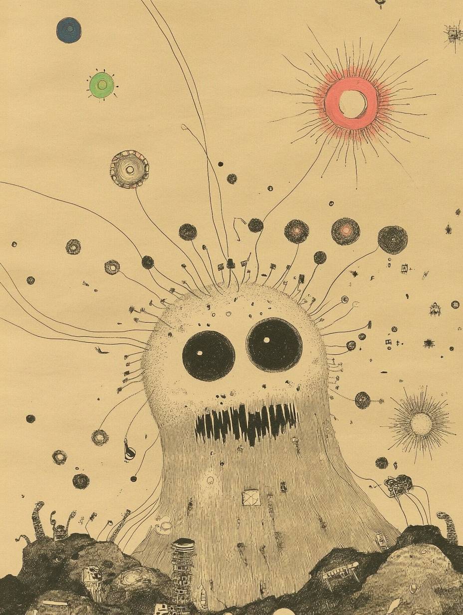 retro sci-fi pulp style, cosmic horror, monstrous robotic entity emerges from interdimensional portal, surrounded by the remnants of fallen civilizations and otherworldly phenomena, tentacle-like cables, reality-warping effects, eldritch symbols, chaotic scene with swirling energy vortex, cosmic void with floating debris, vibrant alien sun backlighting, eerie color shifts, bold contrasting color palette, --ar 3:4 --style raw --sref 2070734059 --v 6.1