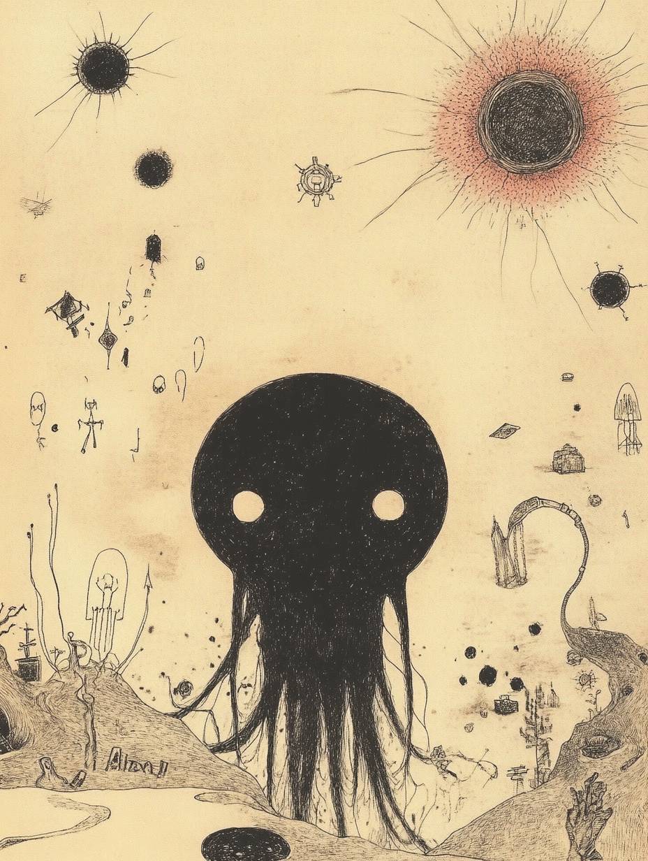 Style pulp rétro de science-fiction, horreur cosmique, une entité robotique monstrueuse émerge d'un portail interdimensionnel, entourée par les vestiges de civilisations tombées et des phénomènes d'un autre monde, des câbles en forme de tentacule, des effets de distorsion de la réalité, des symboles étranges, une scène chaotique avec un vortex d'énergie en tourbillon, un vide cosmique avec des débris flottants, un soleil alien vibrant en arrière-plan, des changements de couleur étranges et une palette de couleurs audacieuses et contrastées.