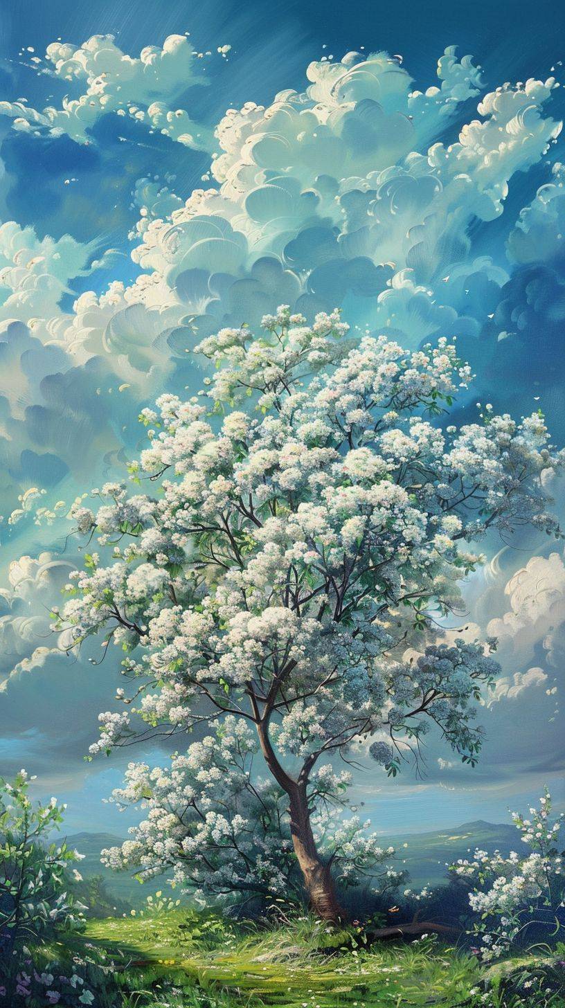 A tree that grows in nature Full of white flowers and green leaves. The sky above was blue and there were some clouds floating around Oil painting style A painting style that focuses on natural aesthetics Return to the ancients Hd, Ultra HD --ar 9:16