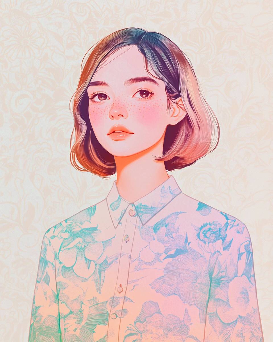 Create a vibrant, anime-style illustration of a young woman with short, glossy hair, wearing a patterned shirt with soft, pastel floral designs. The background should be light and textured, complementing the pastel tones of her clothing. Her face should be clear and smooth, with no freckles, spots, or blemishes. Use a pastel color palette throughout the entire image, with gentle and soothing tones. --no spots --ar 4:5 --stylize 50 --v 6.1