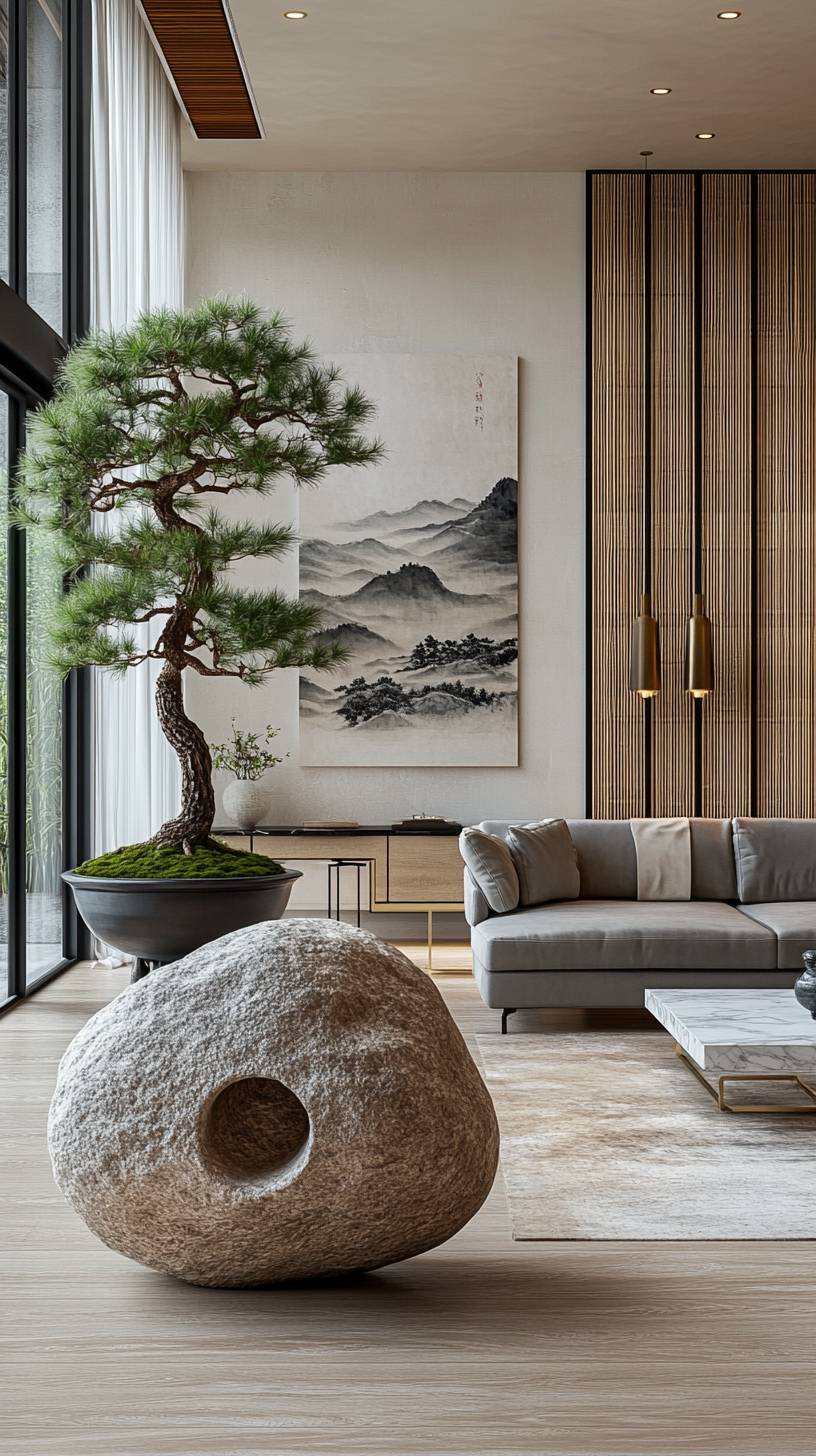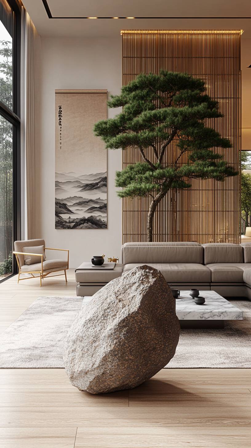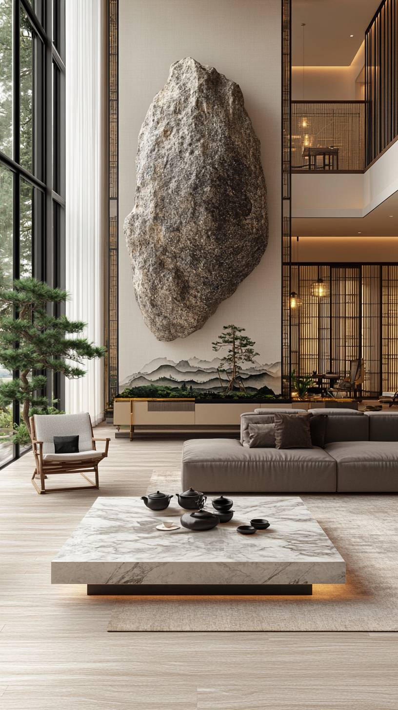 A luxurious 150 square meter living room blending Song Dynasty aesthetics with modern Zen design. Large abstract stone sculpture at the entrance with a bonsai pine tree. Light wood flooring and ink landscape photography on walls. Moroso Redondo sofa in dark grey leather, Baxter Chester Moon lounge chair in off-white. ARMANI/CASA CANALETTO marble coffee table with TURRI BLUES side tables. Hand-woven silk rug with abstract Zen-inspired motifs. Floor-to-ceiling windows with slim black metal frames and sheer white curtains. Flexform Cestone chair near the window. Tatami-style window seat with Zen cushions. Song Dynasty style screen with modern elements in light wood and silk. Hidden multimedia system and built-in tea set display. Recessed LED lighting, modern Xuan paper pendant lights, and brass wall and floor lamps. Song Dynasty style celadon and black pottery artworks. Minimalist calligraphy alongside geometric stainless steel Zen sculptures. Tea ceremony area with exquisite tea sets and tea tray. Elegant bonsai and indoor bamboo grove. Light grey marble flooring with partial light wood flooring. Matte off-white walls with bamboo weave panels and brass decorative strips. Zen tea room with BENTLEY HOME NEWENT tea table. Meditation nook with traditional zafu cushions. Calligraphy area with traditional and modern writing tools. Symmetrical furniture arrangement, clean lines, neutral colors with natural accents, and a sense of tranquility. Photorealistic, interior design, high-end, peaceful atmosphere, balanced composition, spacious layout, subtle fusion of Song Dynasty and modern elements, emphasis on natural materials and texture 3d,c4d, Acid design, behance, virtual art, Hyperfine Detail --no Lighting Online Translation,cushions,tatami mats --ar 9:16 --style raw [...]