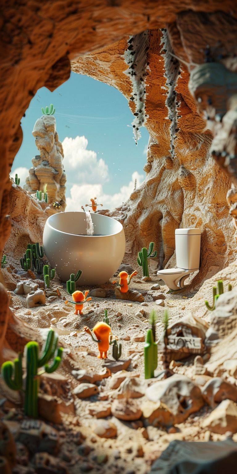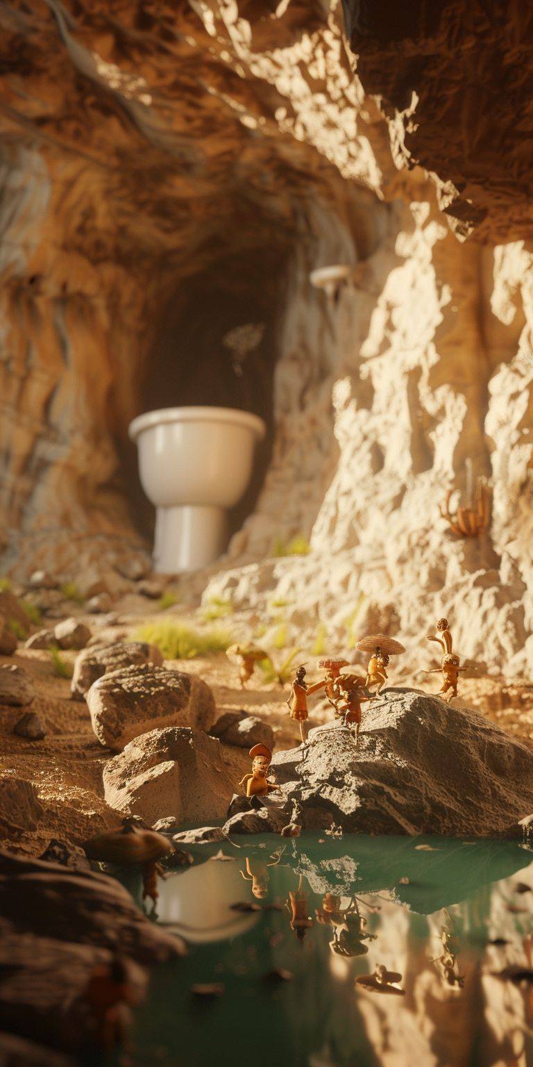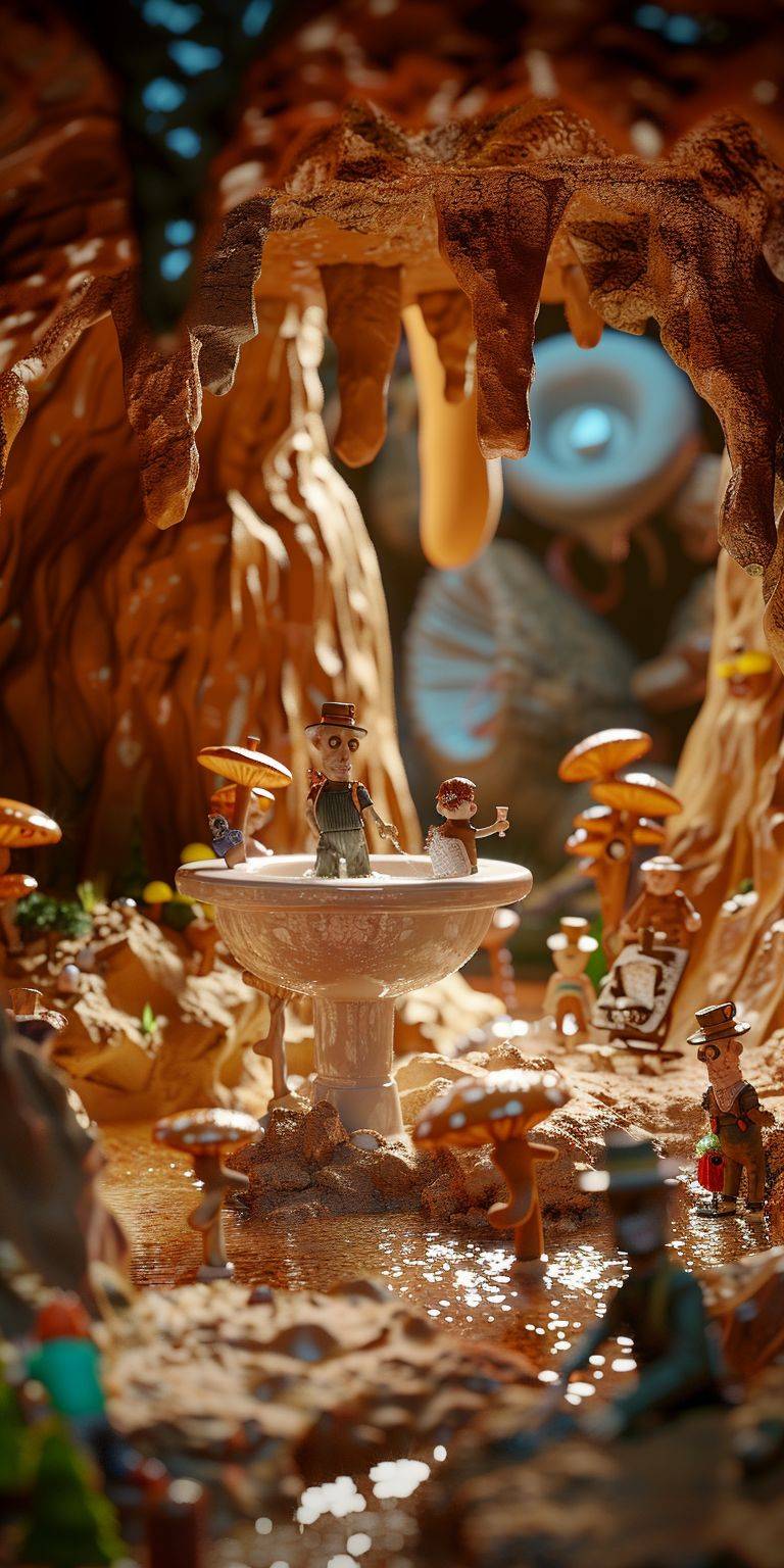 In a cave clay world, with a giant toilet in the background and several small people flushing the toilet below, miniature landscape, Pixar animation style world, movie posters, surrealist style, fantasy scenes 3D,Blender, C4D,OC Render, ultra realisticrendering details,, high quality, masterpiece ,8K --ar 1:2