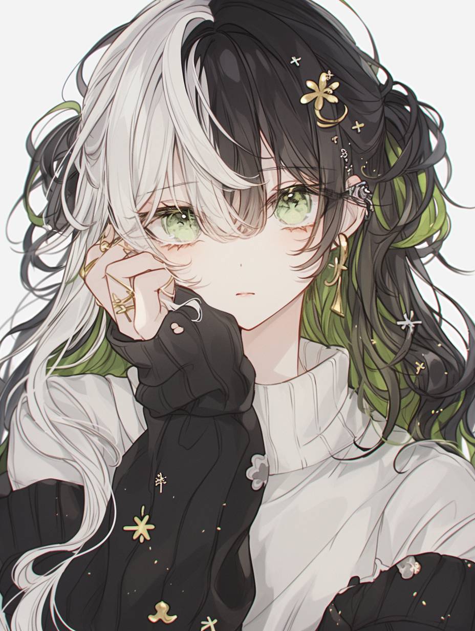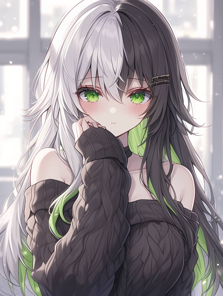 Solo girl, sweater, multicolored dark white hair, multicolored, multicolored hair, long hair, unique hair, green eyes, llustration style --ar 3:4 --style raw --stylize 750 --niji 6