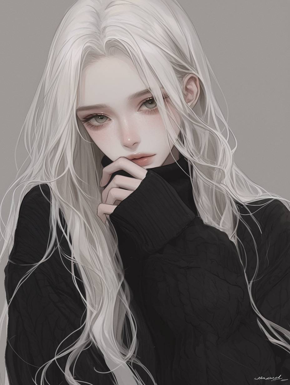 Fille seule, pull, cheveux blancs foncés multicolores, cheveux longs et uniques, yeux verts, style d'illustration