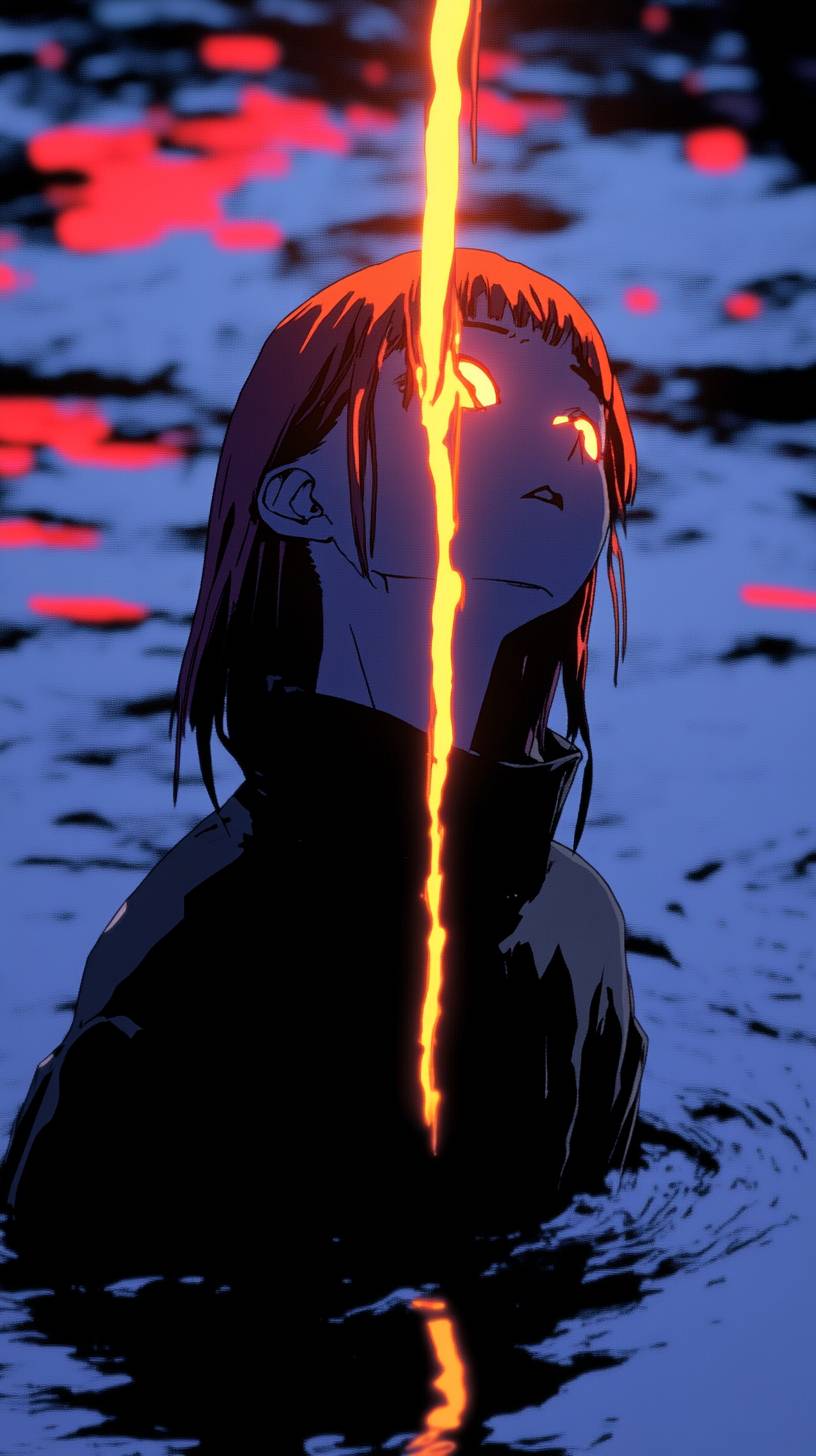 in the style of James Jean, a woman with orange hair and glowing eyes is a rainbow colored dripping in front her face while standing on water at dusk, her head is shaped like flames and she has two long sharp teeth, a reflection can be seen in the river behind her --ar 9:16 --style raw --sref 12062024 --personalize okc4q3u --stylize 250 --v 6.1
