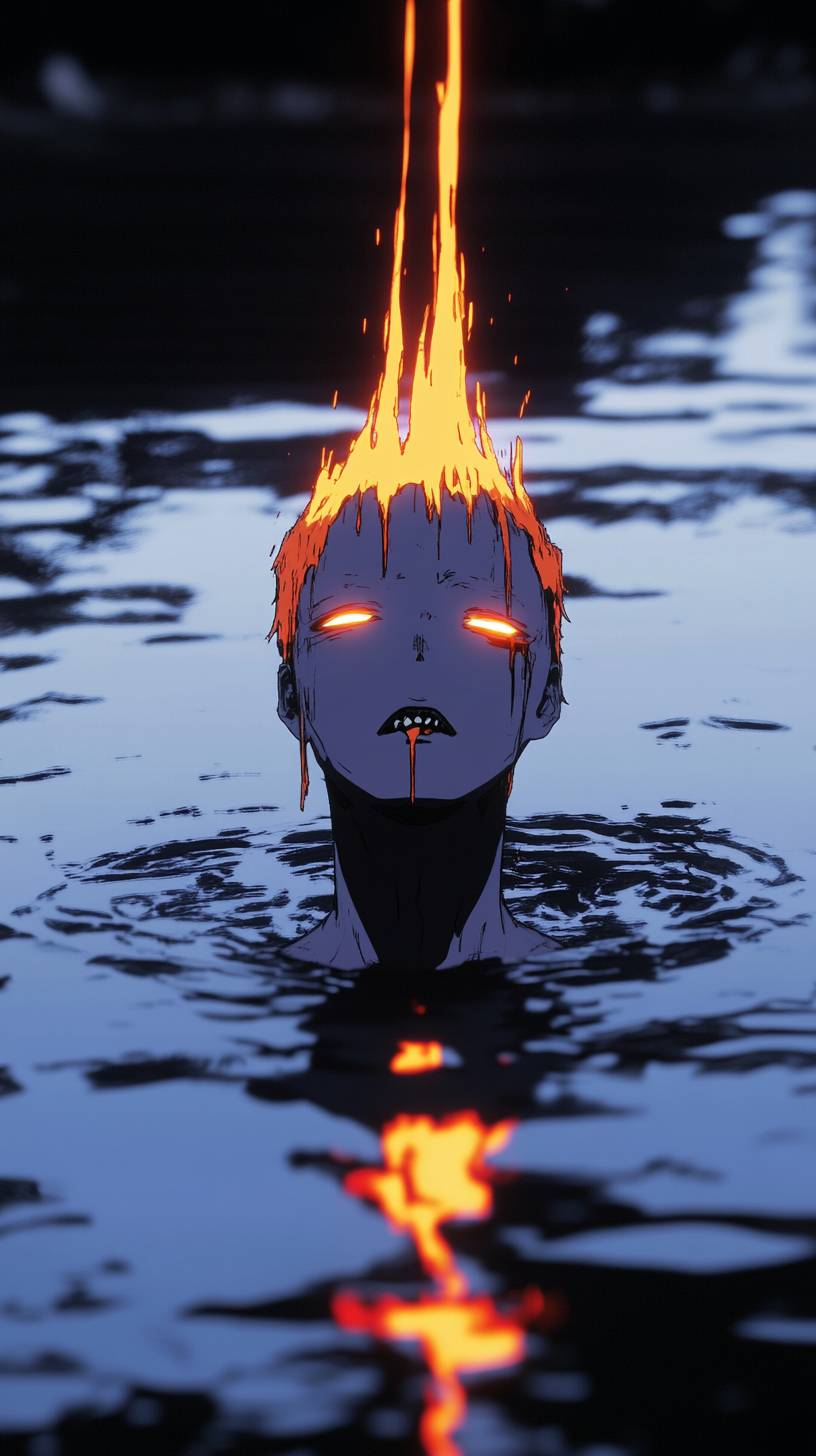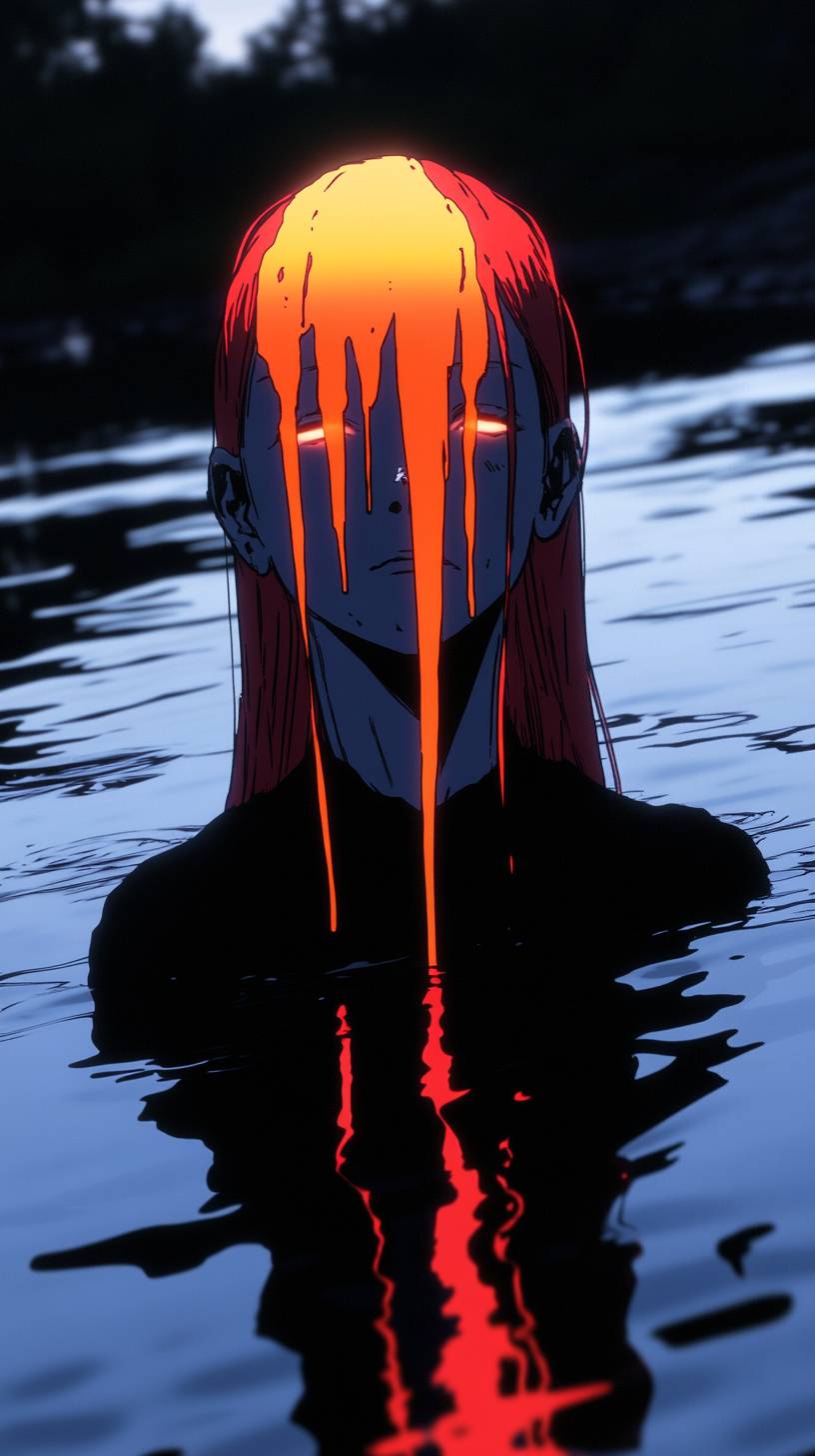 Au crépuscule, une femme se tient sur l'eau avec des cheveux orange et des yeux brillants, une goutte de couleurs arc-en-ciel devant son visage. Sa tête a la forme de flammes et elle a deux longues dents pointues. Un reflet peut être vu dans la rivière derrière elle.