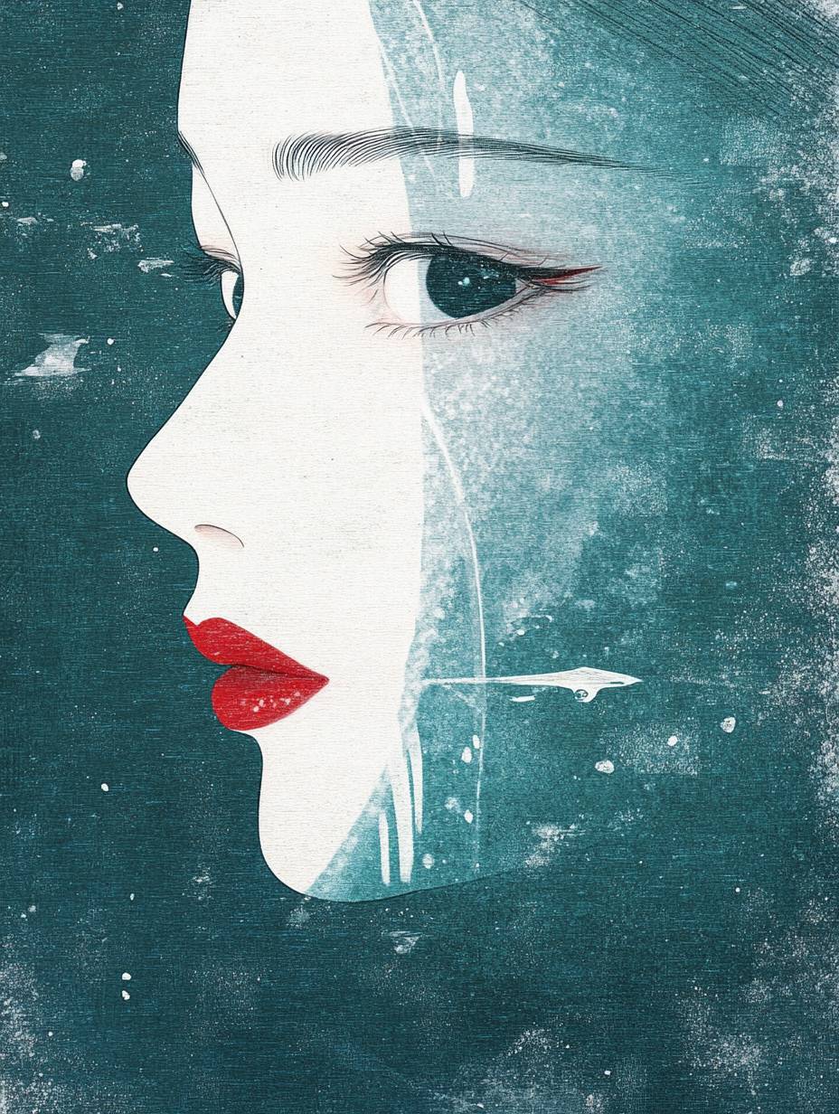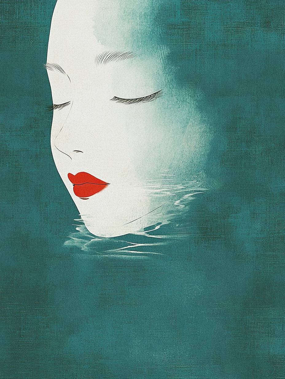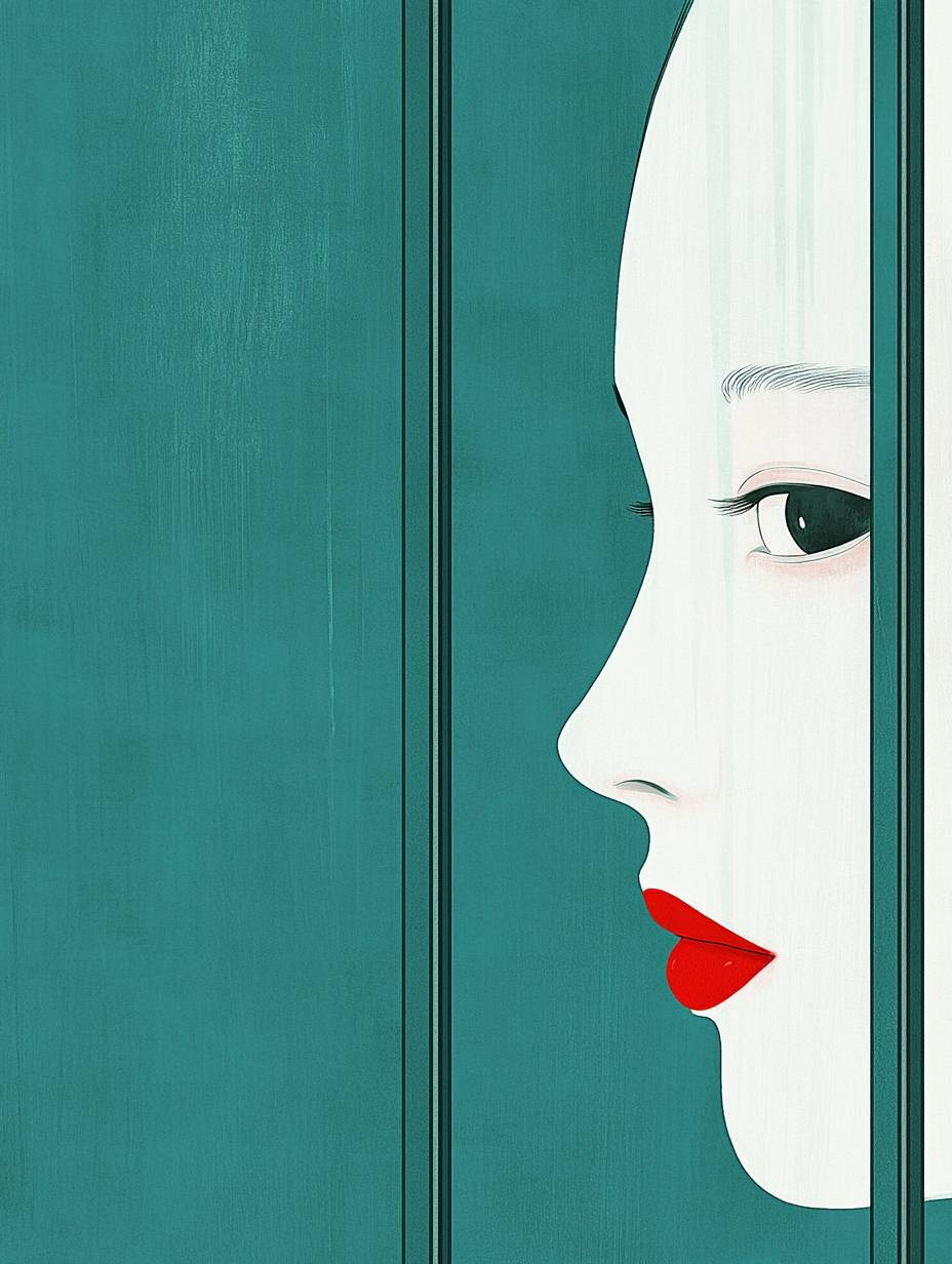 Illustration de livre pour enfants, dans le style bleu-vert de Sansuiga ukiyo-e, visage blanc semblable à une geisha avec du rouge à lèvres rouge, reflété dans le verre, espace négatif, minimalisme