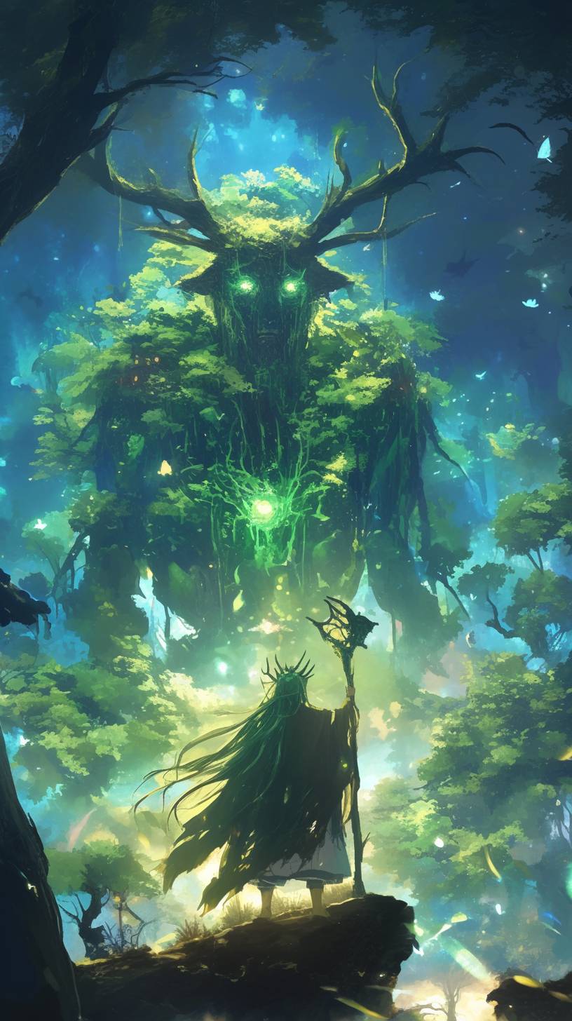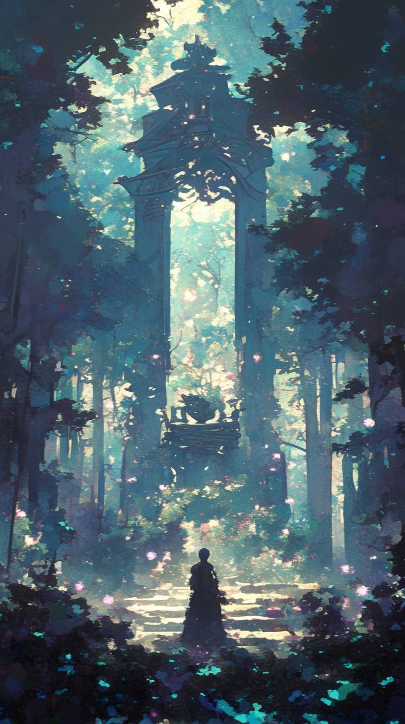 forest guardian's watch, haunted, mysterious, beautiful, dark vibes, mystic, anime, lofi, nature in art --ar 9:16 --niji 6