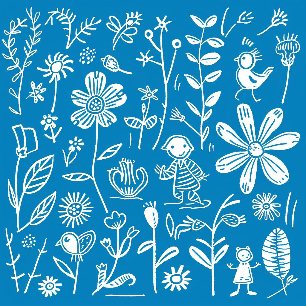 Illustration dans un style doodle représentant des fleurs, des feuilles, des oiseaux et des enfants en contours sur un fond bleu vif.