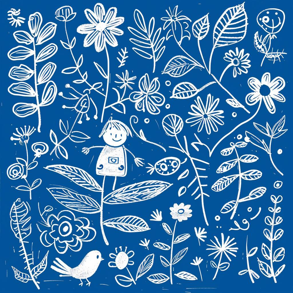 Illustration de style gribouillage de la nature. Illustration représentant des fleurs, des feuilles, des oiseaux et des enfants sous forme de contours, en blanc cassé, dans un style gribouillé sur un fond bleu vif.