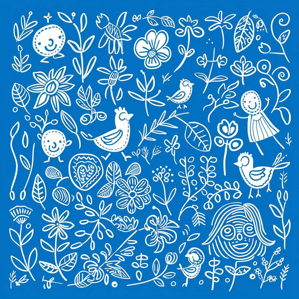 Illustration of nature doodle style. Illustration depicting flowers, leaves, birds and kids as outlines, in off-white, in doodle style on a bright blue background. --v 6.0