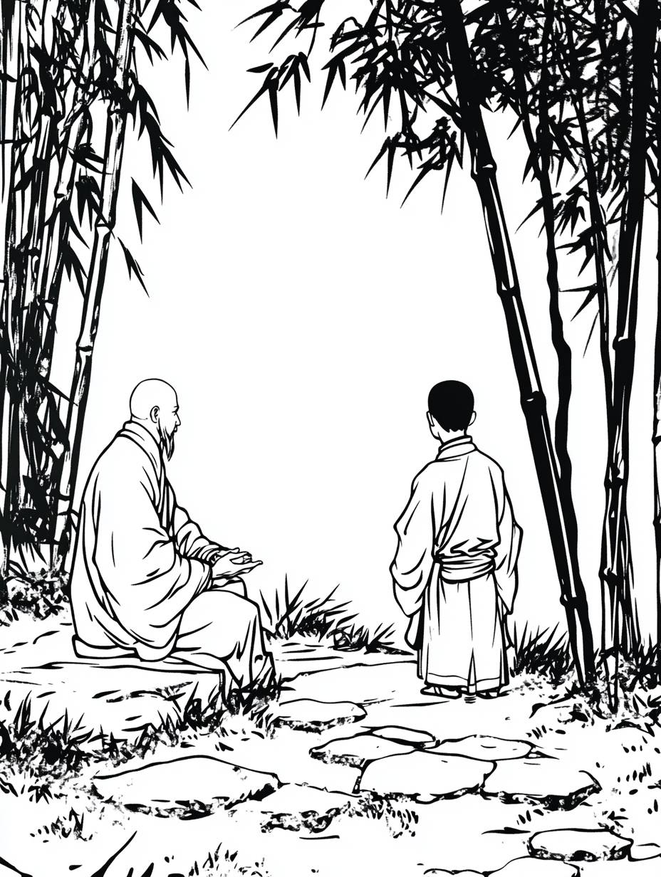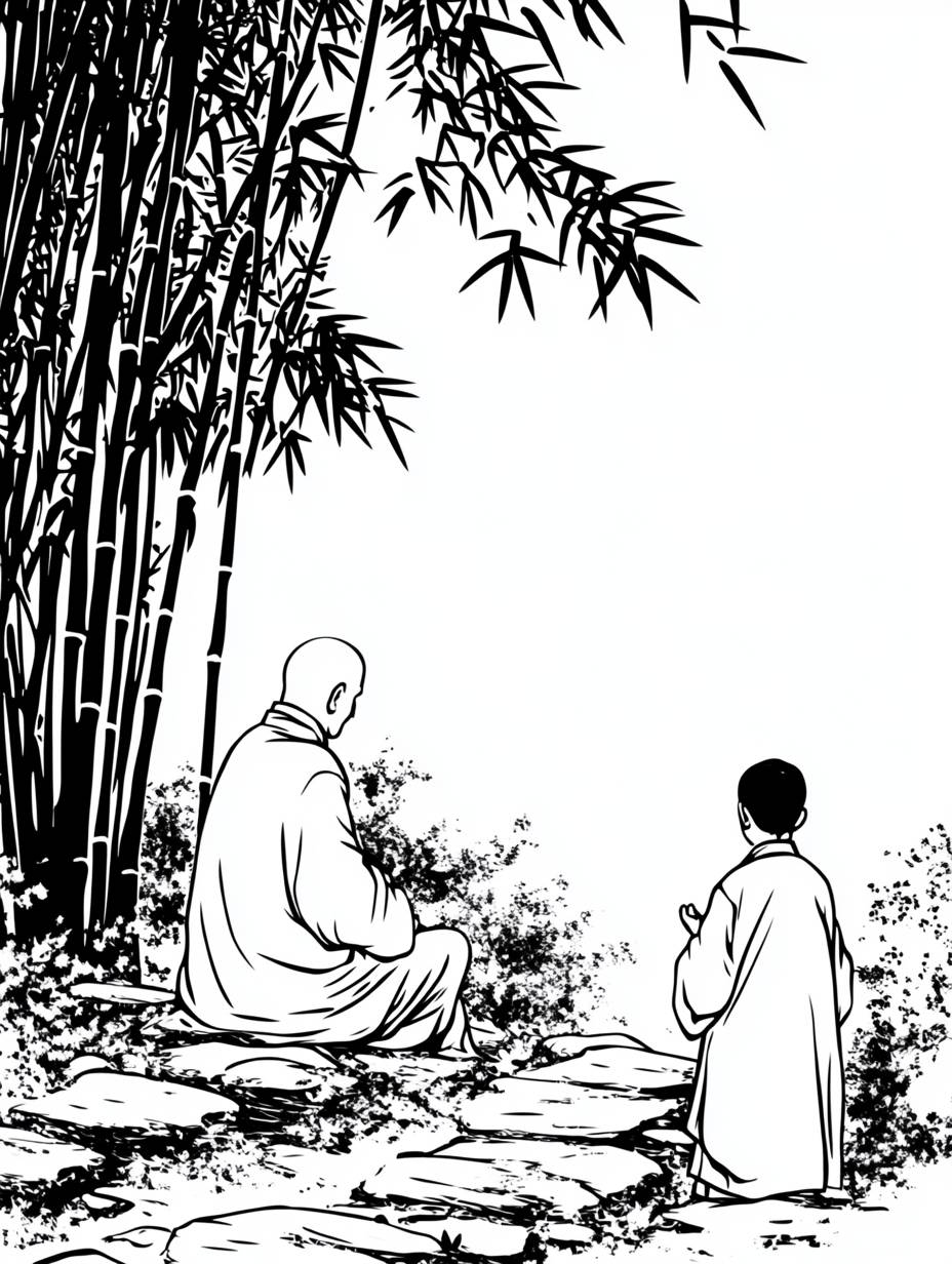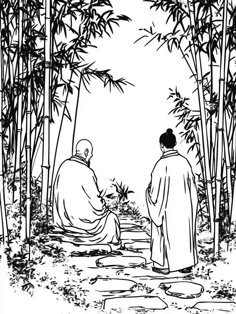 In ancient China, in a dense bamboo forest, there was a middle-aged monk sitting on the steps of a small path, chatting face-to-face with a 10-year-old young monk standing opposite him. The mottled moonlight scattered on the ground, and the winding paths paved with stones of various sizes. The bamboo forest around them stands tall and swaying in the wind,vector flat illustration, vector image, minimalist vector system, white background, black and white style, bold lines, graphic description, high-definition, 8k --ar 3:4 --sref <https://s.mj.run/tnwpnvMB_VE> <https://s.mj.run/NrkpDzwil3Y> <https://s.mj.run/vffDOcOjY2M> --stylize 250 --iw 2 --v 6.1