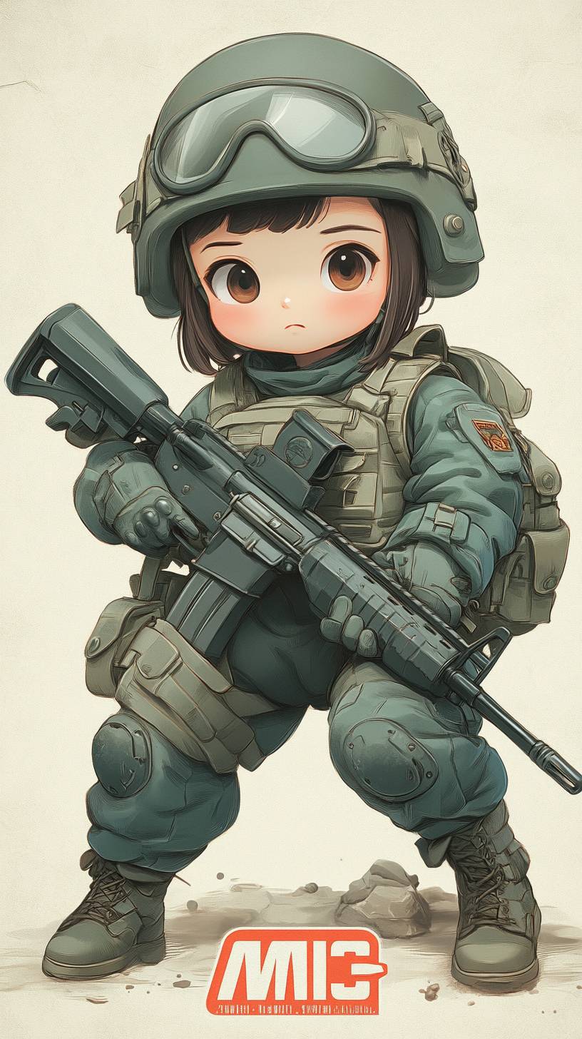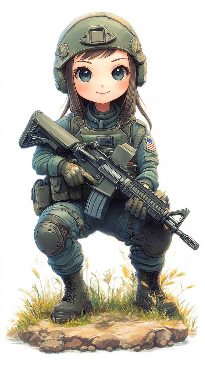 Une fille mignonne en uniforme militaire tenant un fusil M4, dans le style anime.