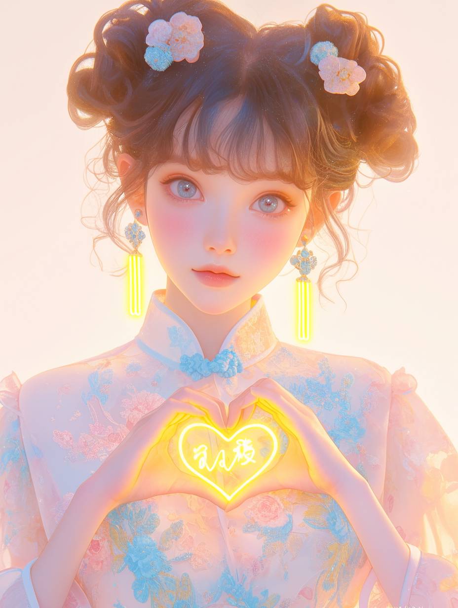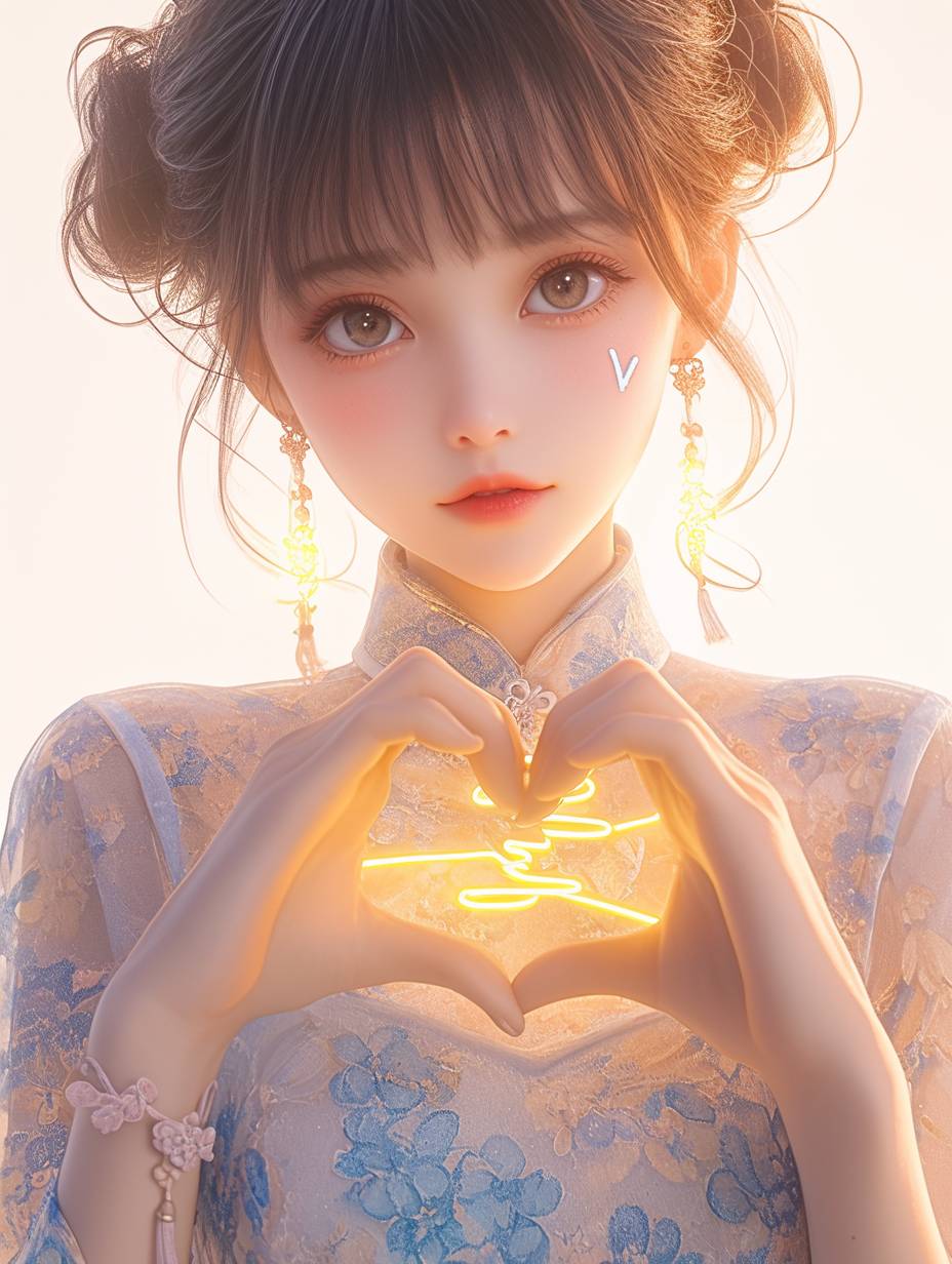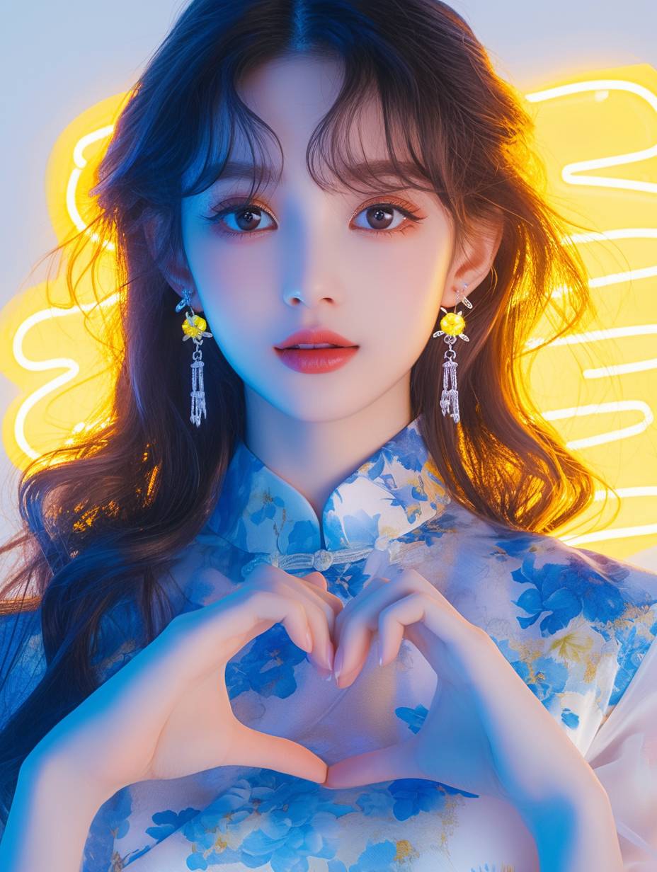 A cute girl holding her hands in the shape of a heart, wearing earrings and a Hanfu style dress with a fluorescent light on a white background, in a pastel color scheme, portrait photography, close up shot, with yellow neon lights and blue floral patterns on the , studio lighting, warm tones, soft shadows, high resolution photography, intricate details, and an elegant style, in the style of Dior. --no Poor quality, blur, watermark, low quality, poor anatomy, poor proportion, poor focus, low resolution, ugliness, extra limbs, disfigurement, mutated hands, poorly painted face, poor body, skin flaws, poorly painted hands, mutated hands and fingers, long neck, broken limbs, too many fingers --ar 3:4 --stylize 200 --niji 6