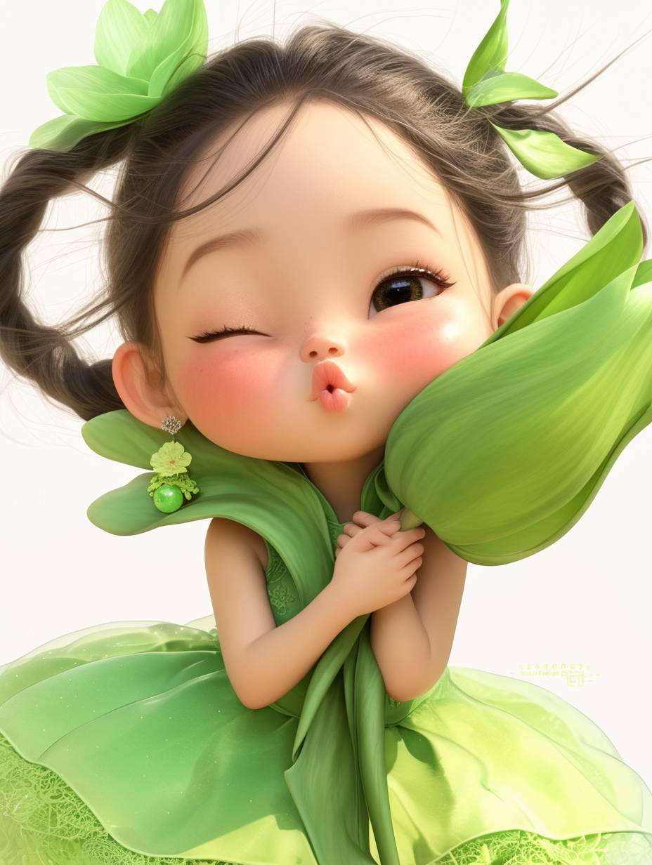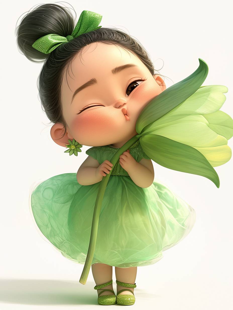 Mignonne petite fille chinoise, visage rond, jambes courtes, yeux larmoyants, gros plan du visage, rouge à lèvres, un œil ouvert et un œil fermé, très espiègle, embrassant la caméra, lèvres pulpeuses, cheveux noirs longs, deux tresses, boucles d'oreilles en fleurs vert clair, grand nœud vert dans les cheveux, portant un tutu en chiffon vert clair, très mignonne, tenant une tulipe verte surdimensionnée dans ses deux mains, joli portrait en pied sur un fond blanc transparent dans le style d'un design de poupée mignonne, peau claire et lisse, style cartoon 3D, style Pixar, détails en haute définition.