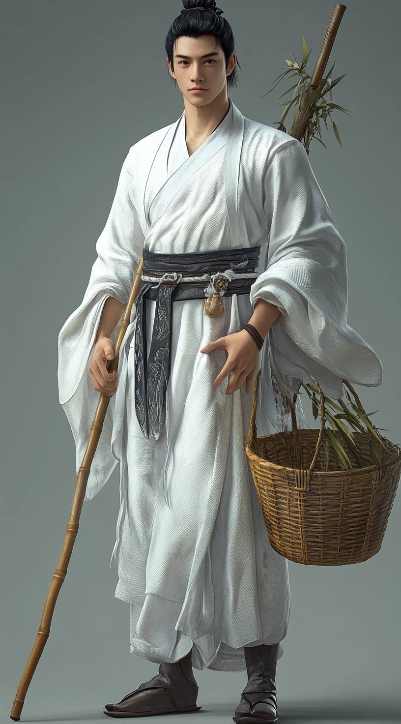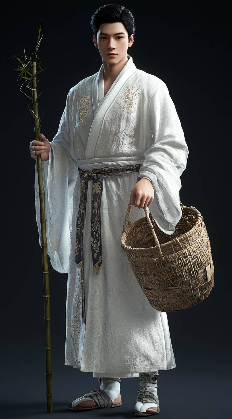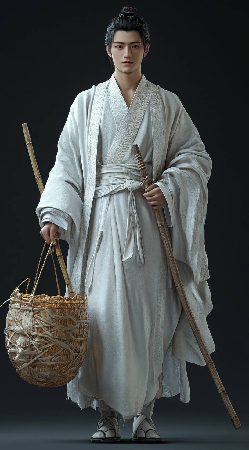 A handsome young Chinese scholar, full body photo, wearing white Hanfu with a white collar, carrying an ancient Chinese bamboo basket and holding a bamboo staff. This is a game character design, concept art, full body portrait, 3D rendering created in Unreal Engine with high detail and resolution, full body perspective, high definition. --ar 71:128 --v 6.1