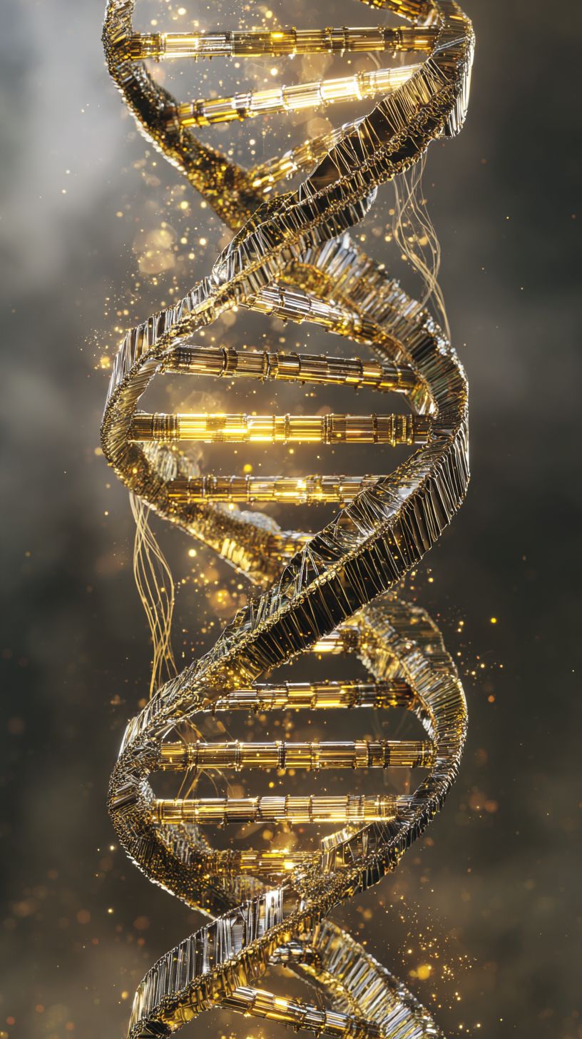 Image macro SEM inspirée par le quantique du 'Génome de Prosperité Dorée', une structure moléculaire complexe en forme d'ADN composée de rubans métalliques ultra-fins et de micro-nœuds cristallins irradiant une lueur d'or fondu. L'hélice présente des nano-textures en couches, des micro-grooves gravés, des facettes réfléchissantes et de la poussière scintillante incrustée à la surface. Des flux de particules quantiques dorées tourbillonnent à travers et autour de l'hélice, symbolisant l'écoulement actif de l'énergie de richesse. L'éclairage directionnel à fort contraste révèle chaque détail minuscule de la surface métallique, tandis qu'un vignettage doux ajoute de la profondeur et une atmosphère. Clarté hyper-réaliste, profondeur de champ extrême, précision scientifique mélangée à la divinité opulente. Arrière-plan rempli de micro-brume légère, de nano-étincelles et de matière particulaire flottante. Composition propre, résolution 8k, esthétique scientifique macro. Pas de texte, pas de lettres, pas de logo, pas d'inscriptions.