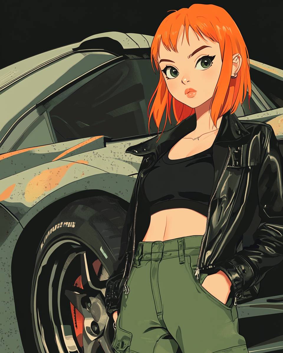 A minimalist anime illustration featuring a character with large, expressive eyes and simplified facial features. The style includes minimal shadowing and smooth, flat colors to create a clean and polished look. The character has bright orange hair and is wearing a black leather jacket and green cargo pants. The scene is set against a highly detailed sports car with soft, natural lighting that accentuates its curves and reflective surfaces. The overall aesthetic combines a serene environment with an emphasis on streamlined, bold outlines and subtle color gradients --ar 4:5 --v 6.1