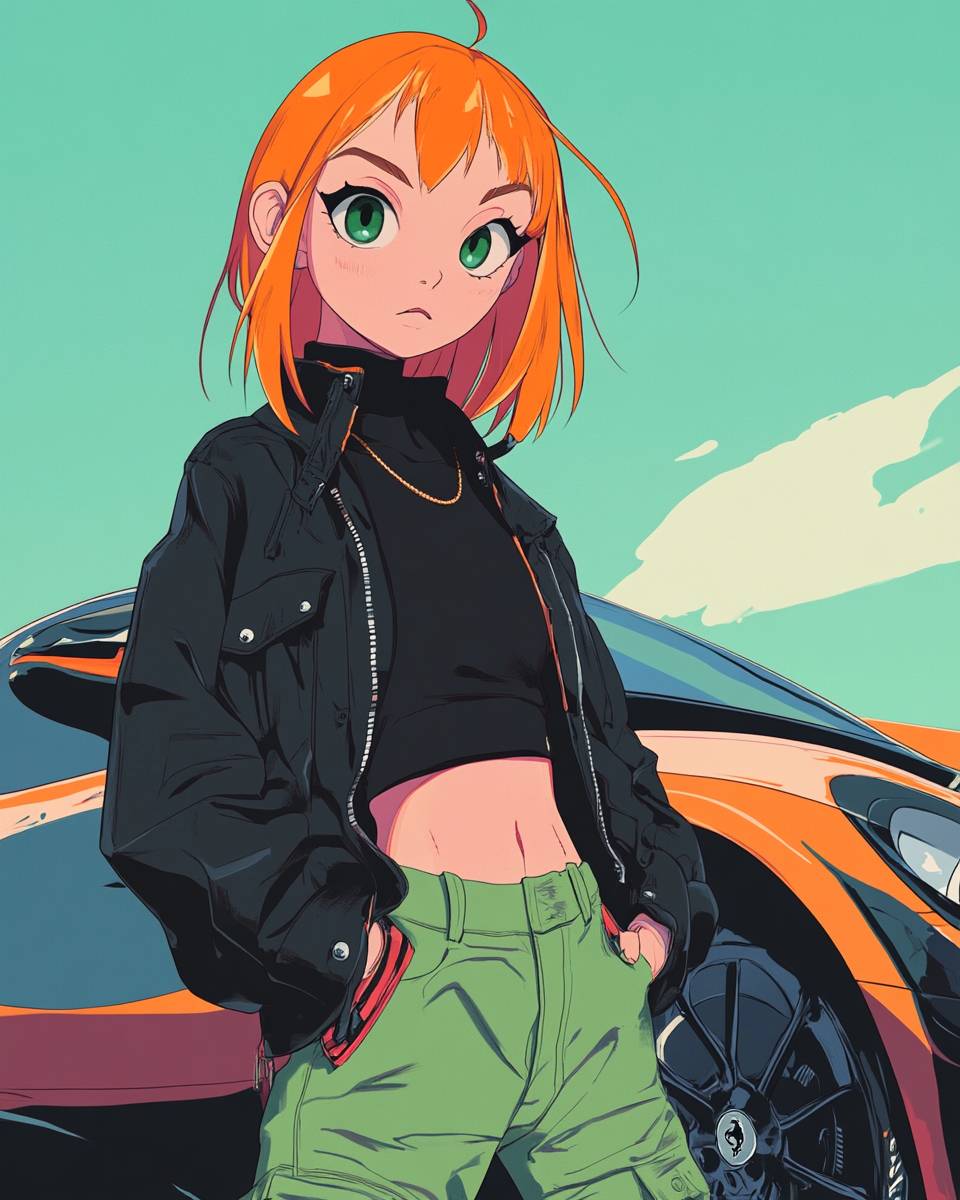 大きく表情豊かな目と簡略化された顔の特徴を持つキャラクターを特徴とするミニマリストのアニメイラスト。スタイルには最小限の影と滑らかでフラットな色を含んでおり、クリーンで洗練された外観を作り出しています。キャラクターは明るいオレンジ色の髪を持ち、黒いレザージャケットと緑のカーゴパンツを着ています。シーンは、曲線と反射面を強調する柔らかい自然光の中にある非常に詳細なスポーツカーの前に設定されています。全体的な美学は、スムーズで大胆な輪郭と微妙な色のグラデーションを強調した穏やかな環境を組み合わせています。