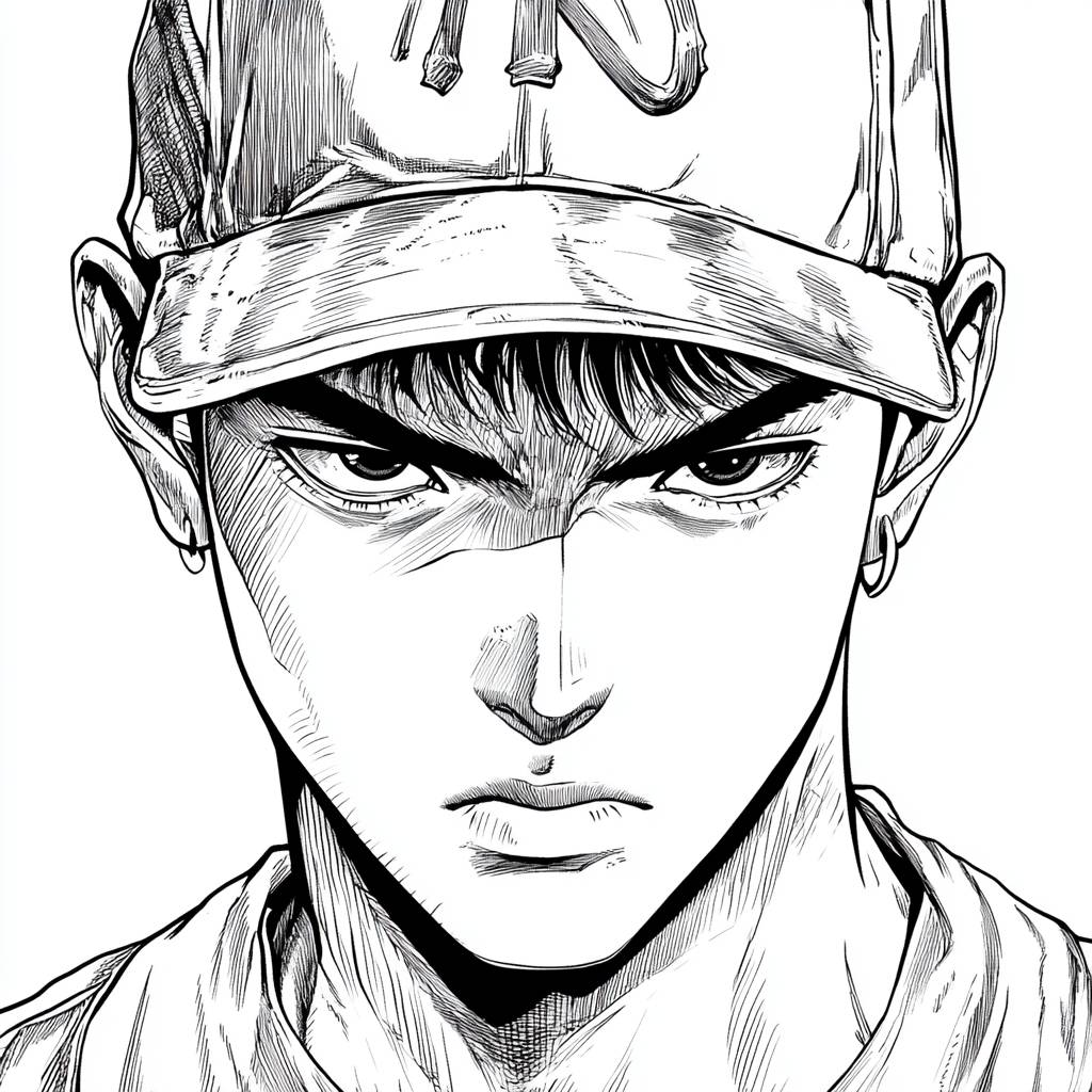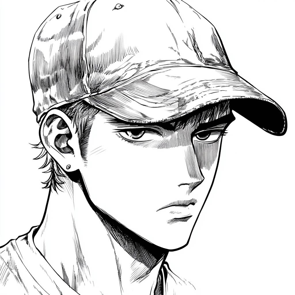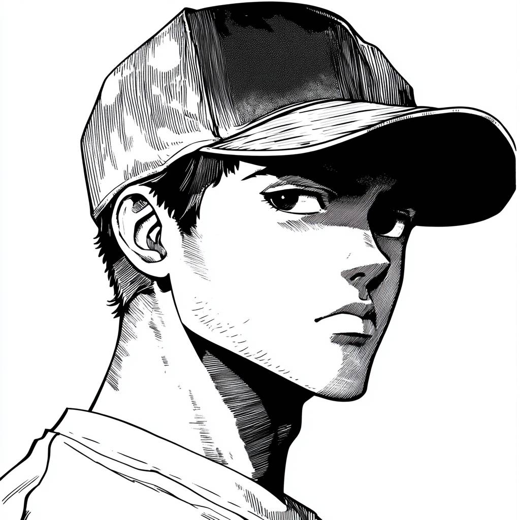 1970s,manga,man,baseball cap,lineart,skinhead,Black eyes-s1000