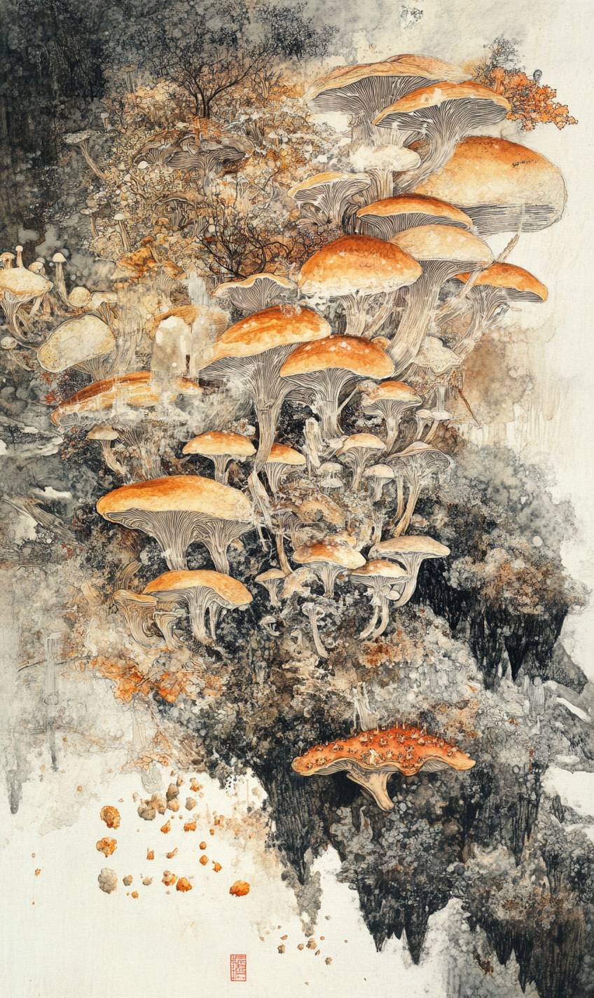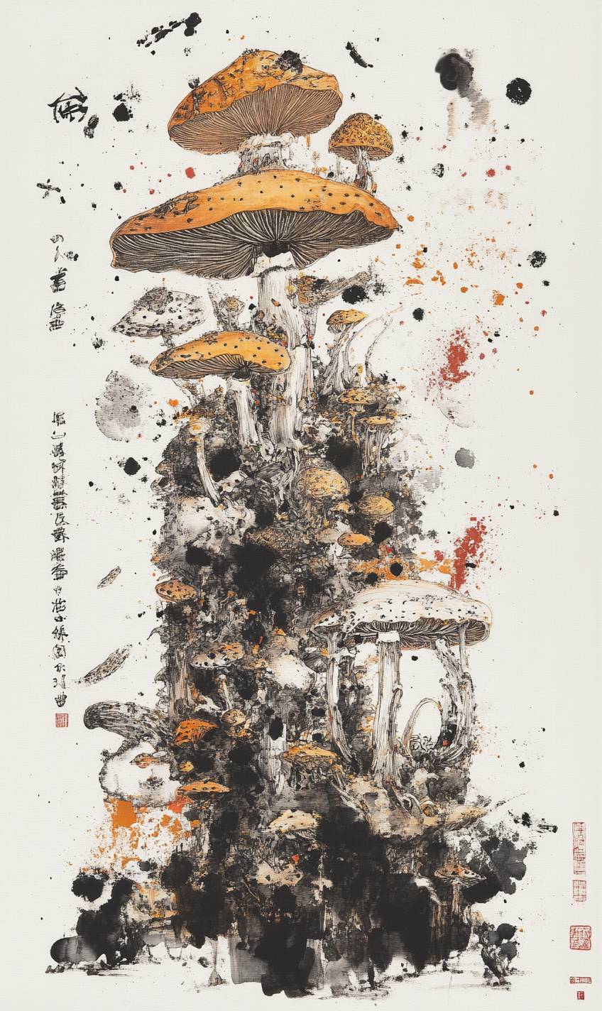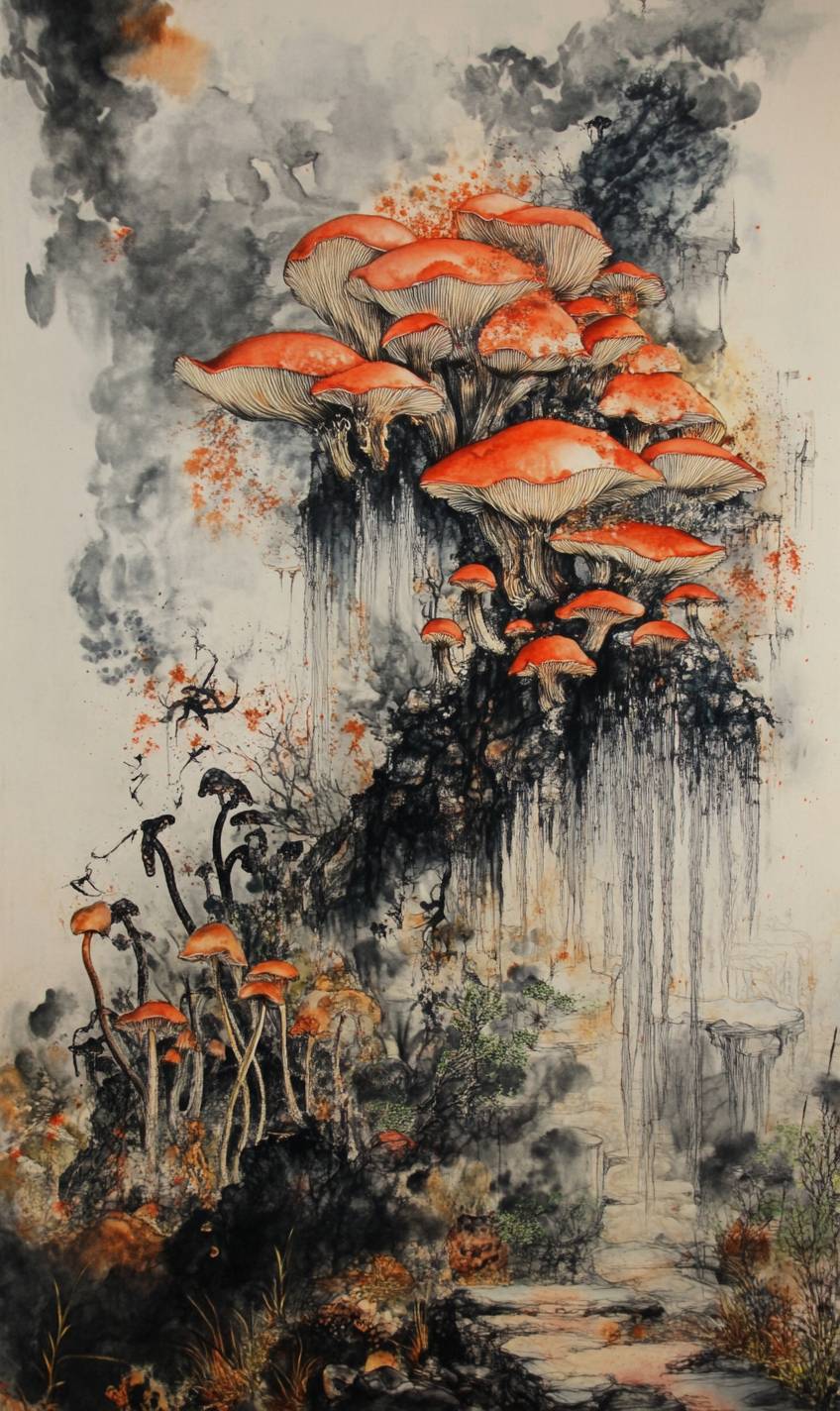 Fungi Kingdom. Traditional art illustration by Cai Guo-Qiang --v 6.1 --ar 3:5