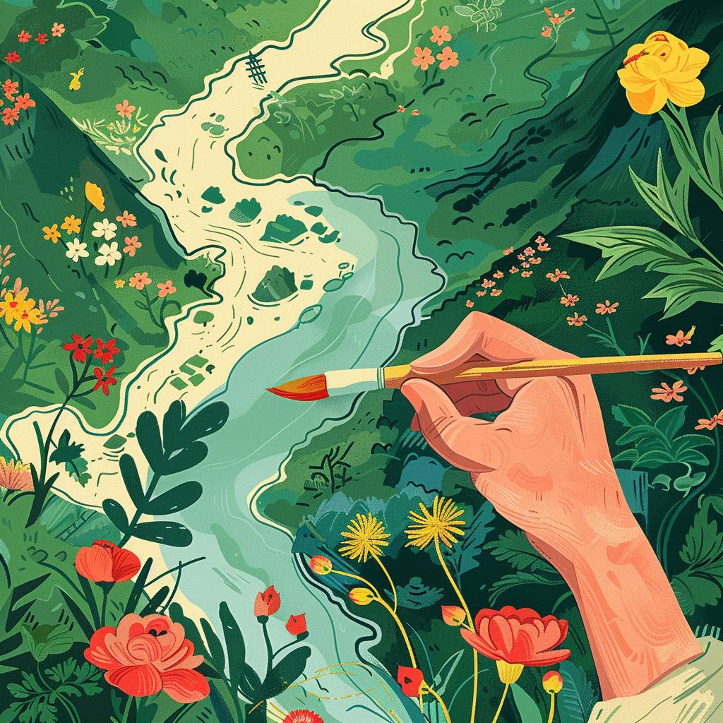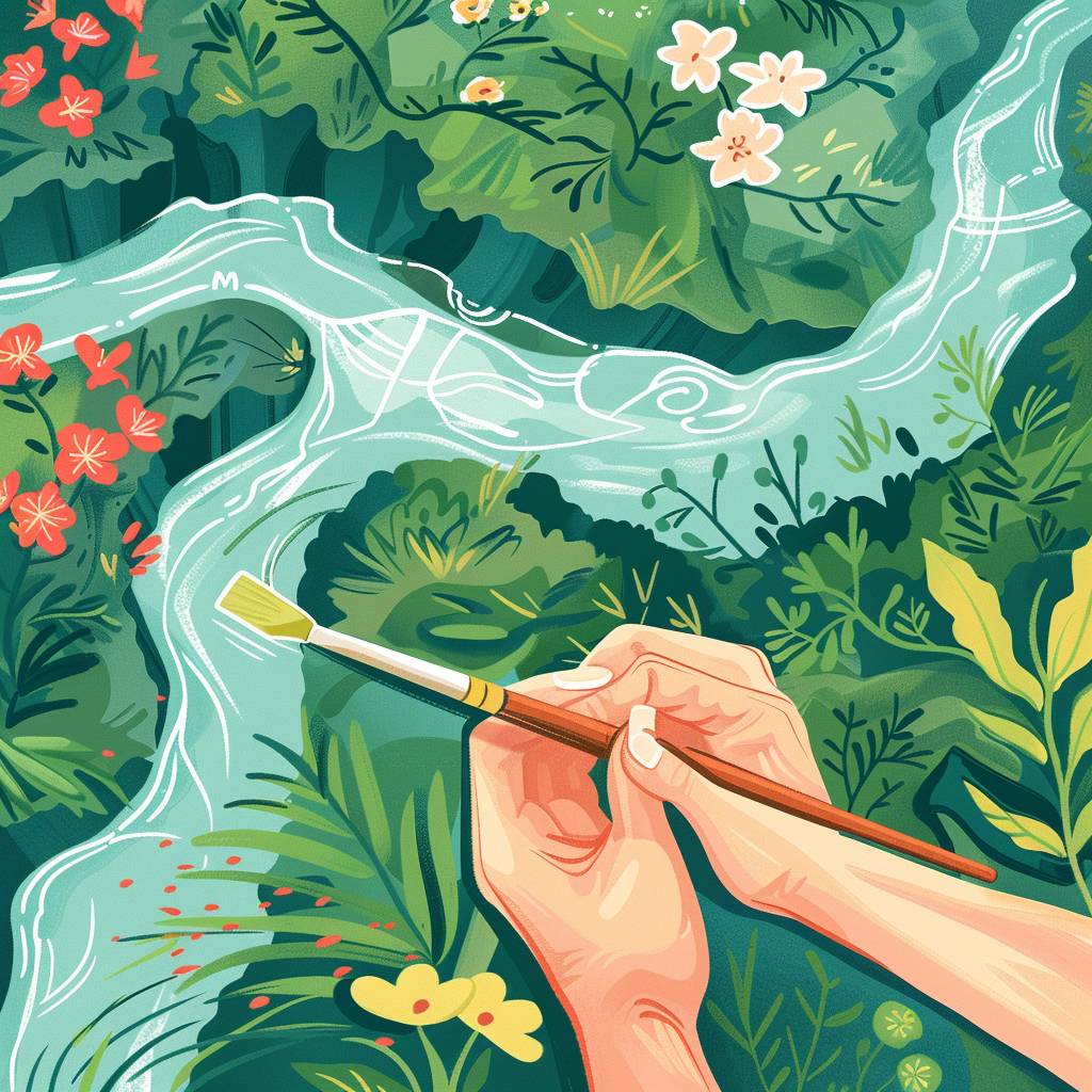 春に川を描くアーティストの手と周りの花々、緑が生い茂る風景、創造性を象徴するシーン。