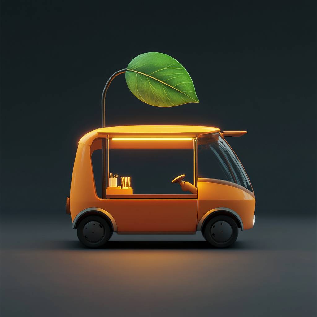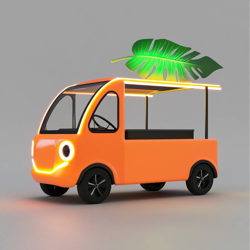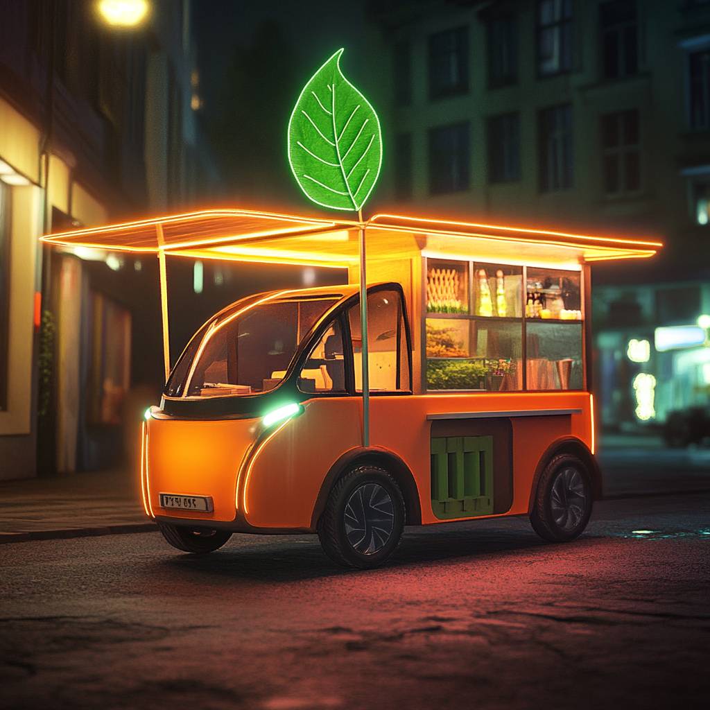 Create a mobile stall, food truck, orange electric vehicle with a pole on the roof supporting a glowing green leaf --v 6.1