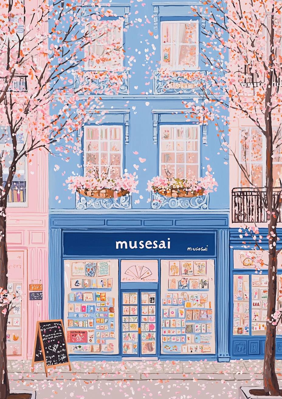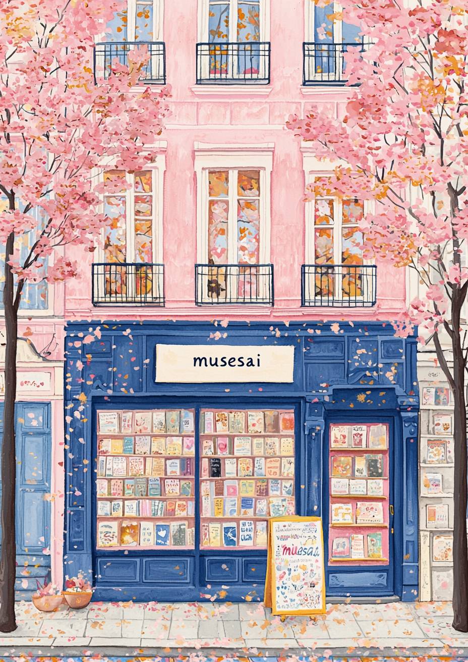 Autumn Festival, a bookstore with "musesai" on the front, from a painting by person, in the style of folk art-inspired illustrations, bold patterned quilts, pastel colours, bloomcore, mixes painting and ceramics, precise, detailed tensegrity architecture paintings, cute and dreamy, illustration by Olivia Gibbs, --ar 100:141 --quality 2 --style raw --personalize hq1xebf --stylize 1000 --v 6.1