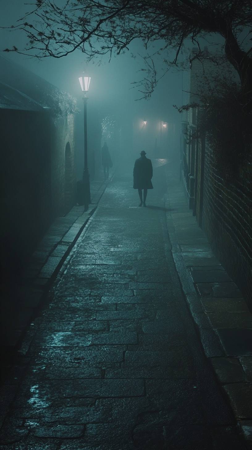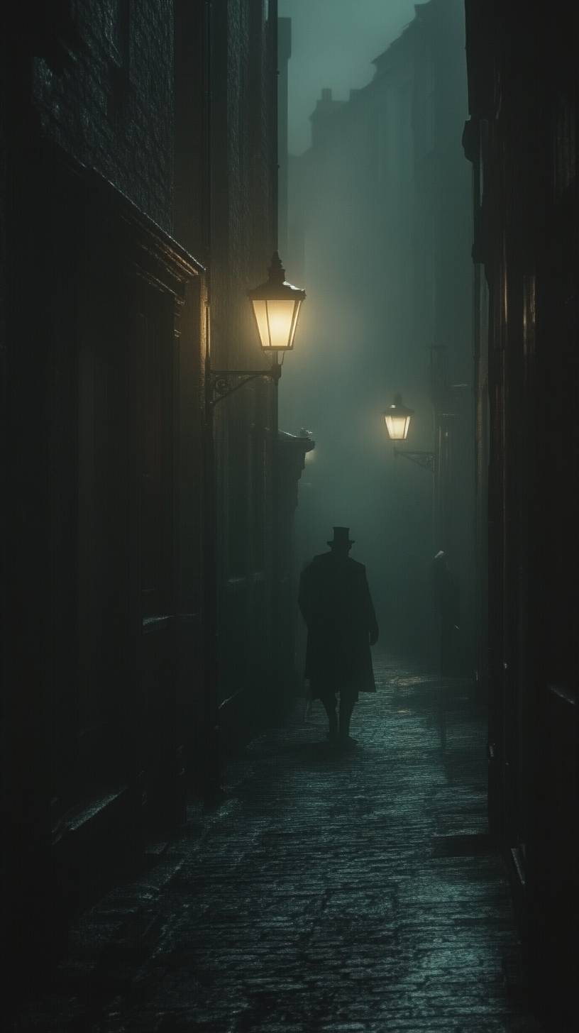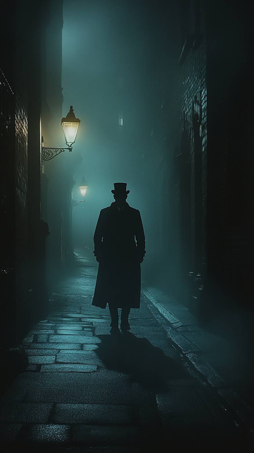 A foggy Victorian London street at night, with the shadowy figure of Jack the Ripper lurking in the mist, the dim glow of street lamps barely illuminating the narrow alleyways, cinematic, 8k --ar 9:16 --v 6.1