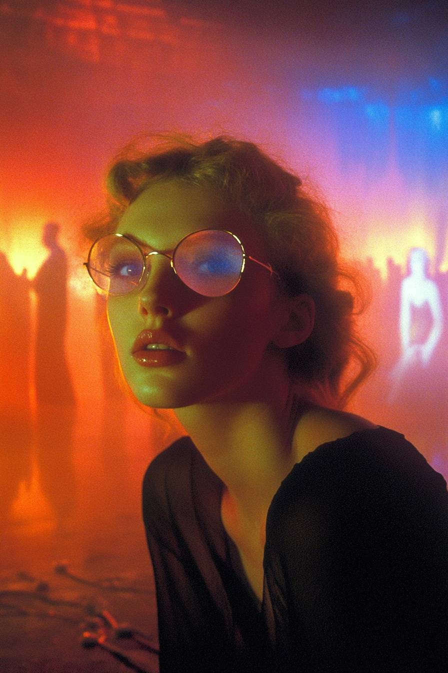 短いスパンコールドレスを着た美しい女性が雨の中に立っています。カラフルな光が水滴に反射しています。彼女は赤いハイライトのある長い髪を持ち、ぼやけた背景の中で彼女の顔が強調されています。