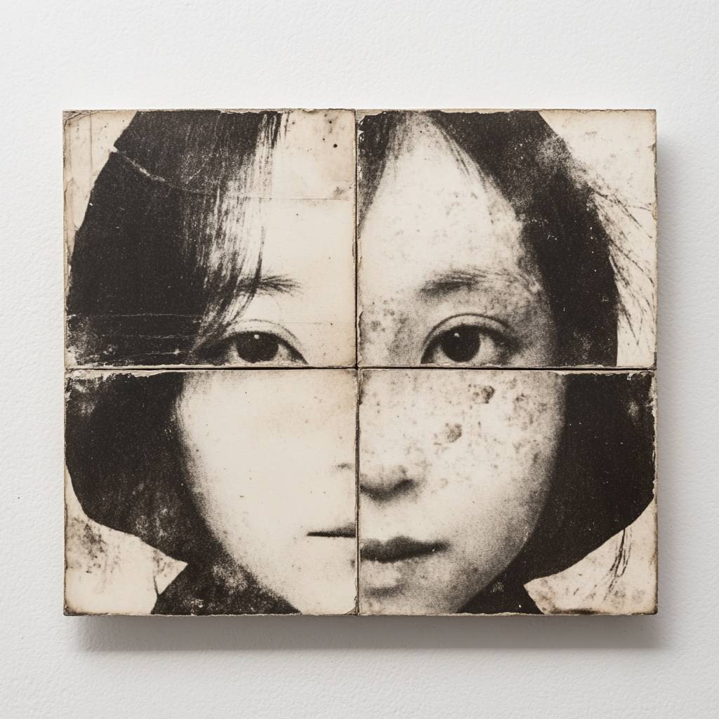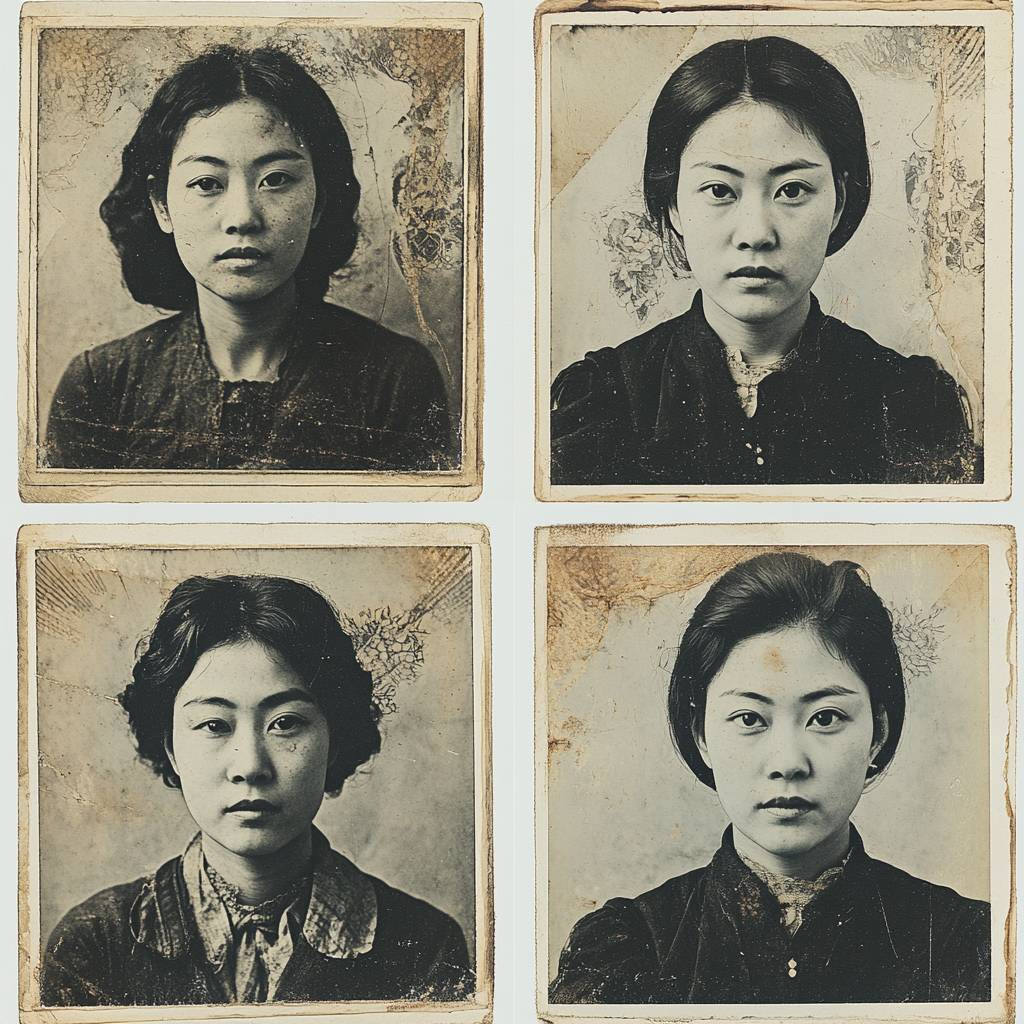 Carte-de-visite albumen silver print, grid of four, Yuki Matsumura, vintage sgraffito, white borders" --v 6.1