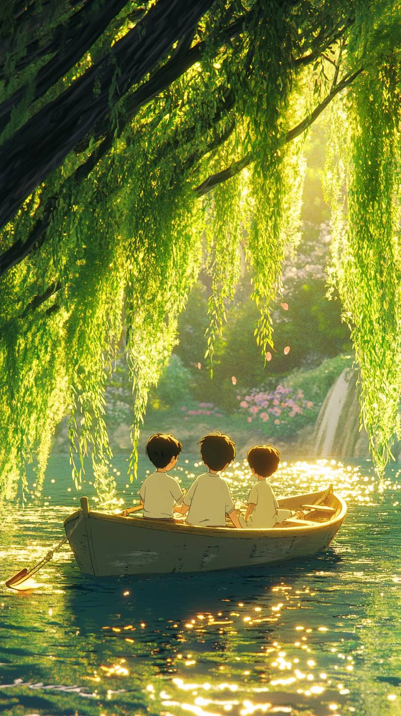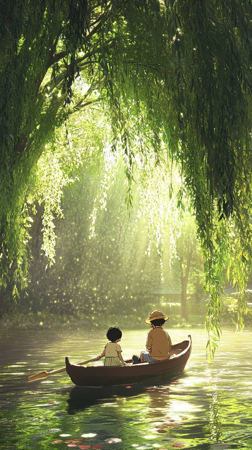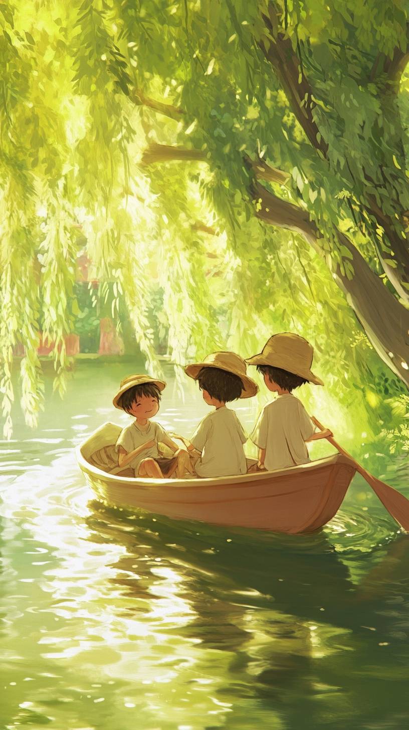 Hayao Miyazaki style, children, boating, willow, sunshine, --ar 9:16 --style raw --stylize 50 --v 6.1