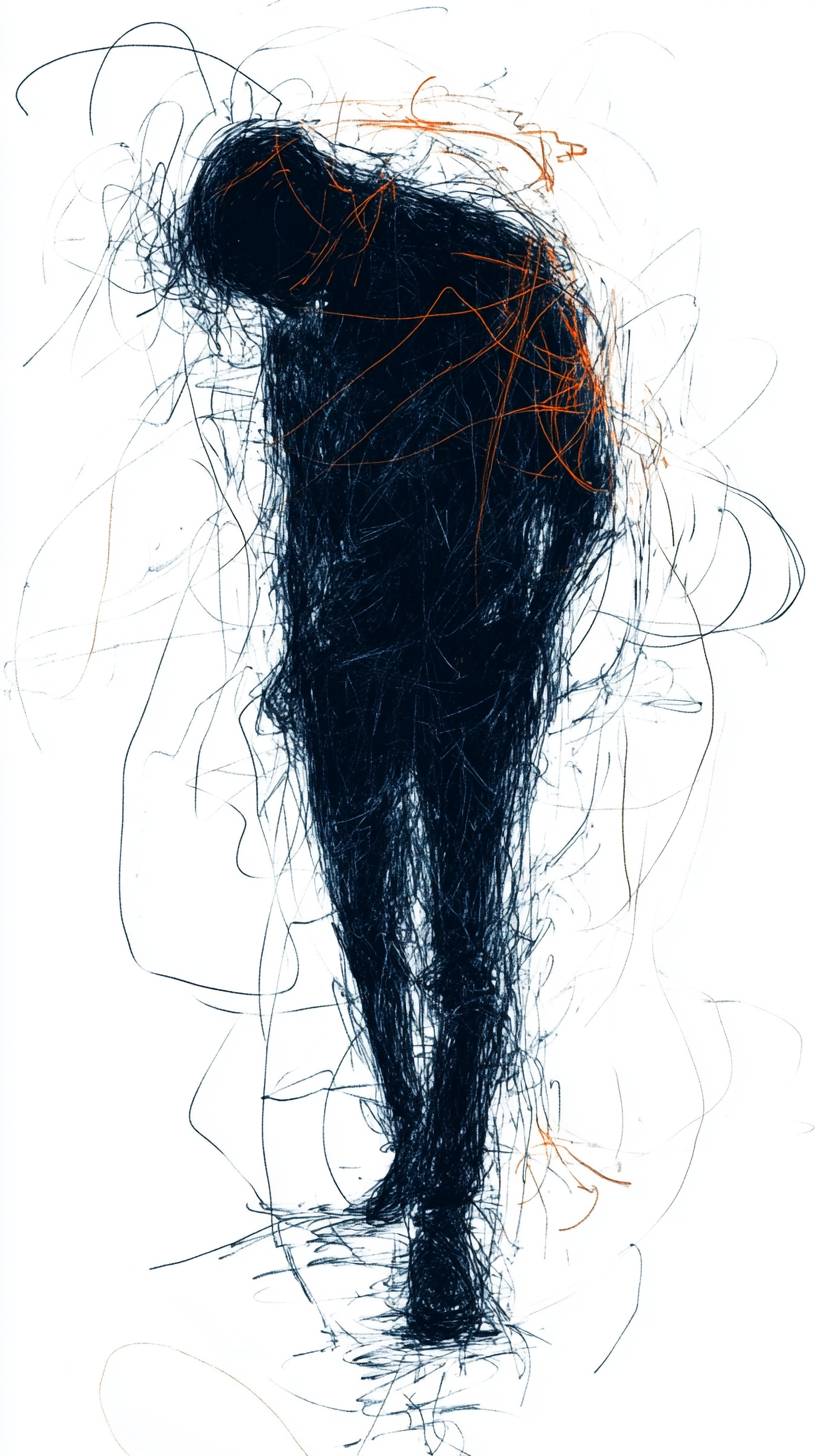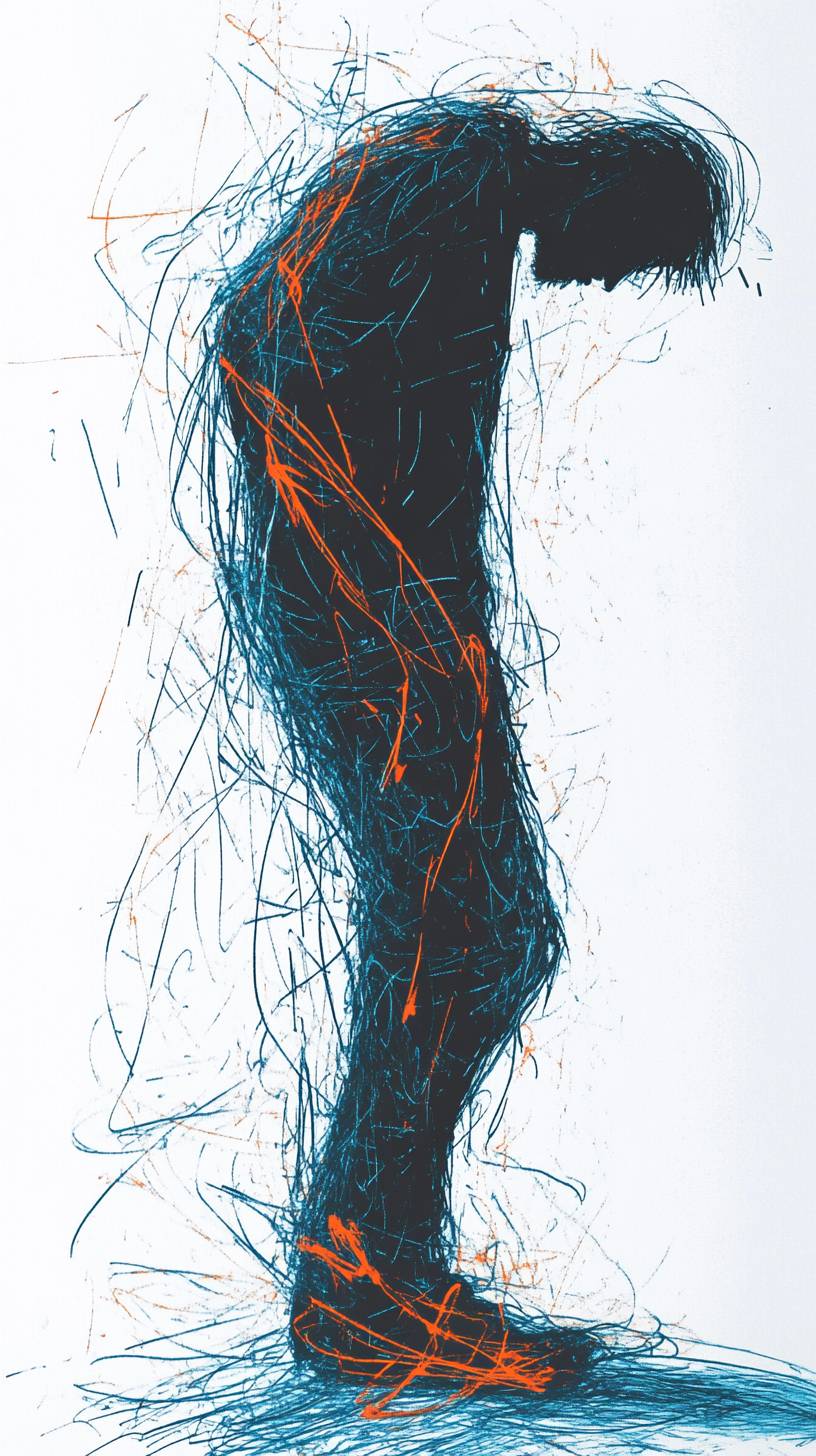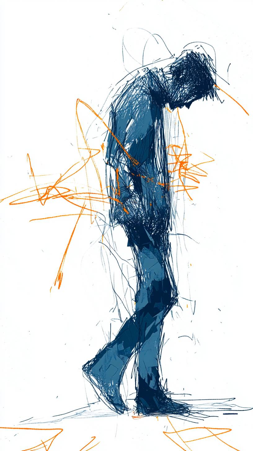 a scribble art of a man walking with his head down and hands in his pocket, in the style of scribble art, minimal, white back drop, blue tones, orange, depressing, moody --ar 9:16 --v 6.1