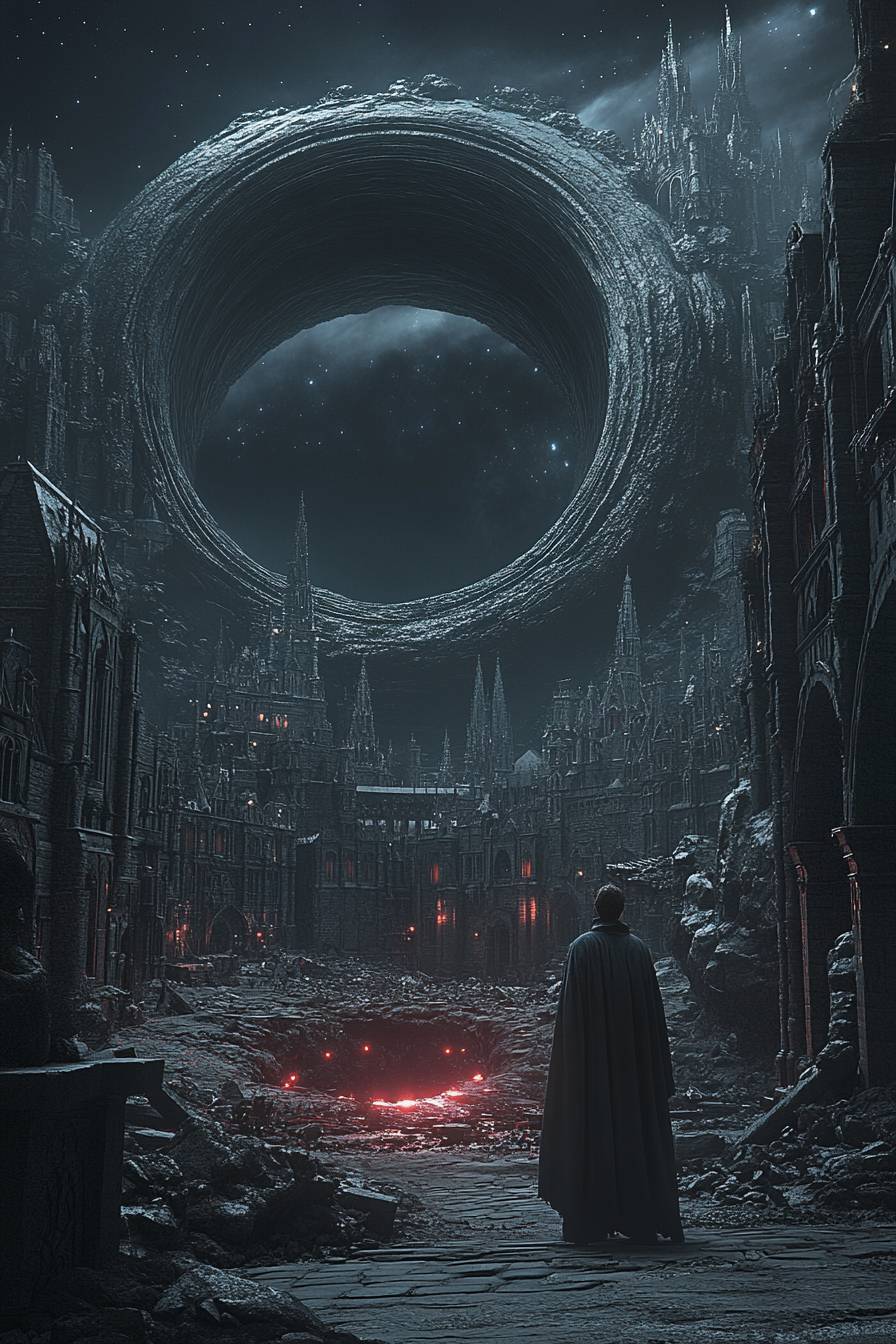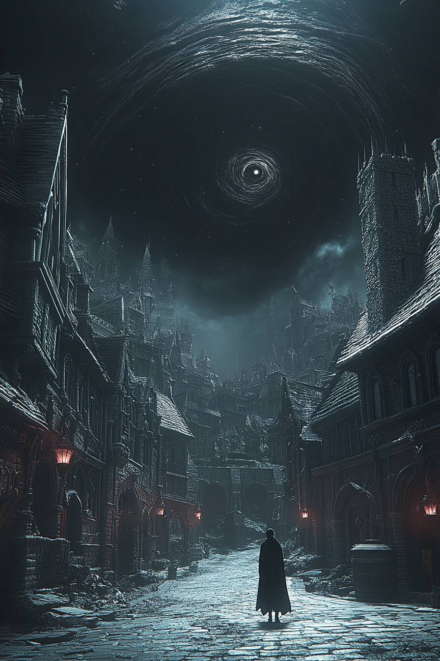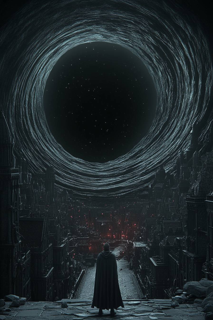 ダークファンタジー、3Dレンダリングの街がブラックホールに飲み込まれ、町の住人が星空のブラックホールを見上げている。背景には中世の町が設定されており、ブラックホールは赤い光と町の破片に囲まれ、雰囲気は不気味で恐ろしい。